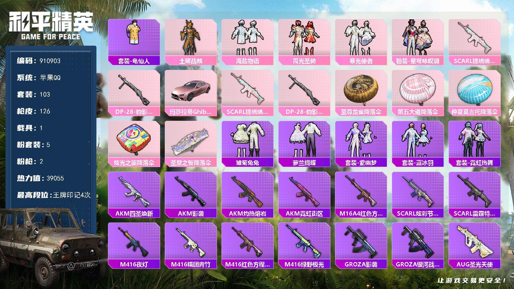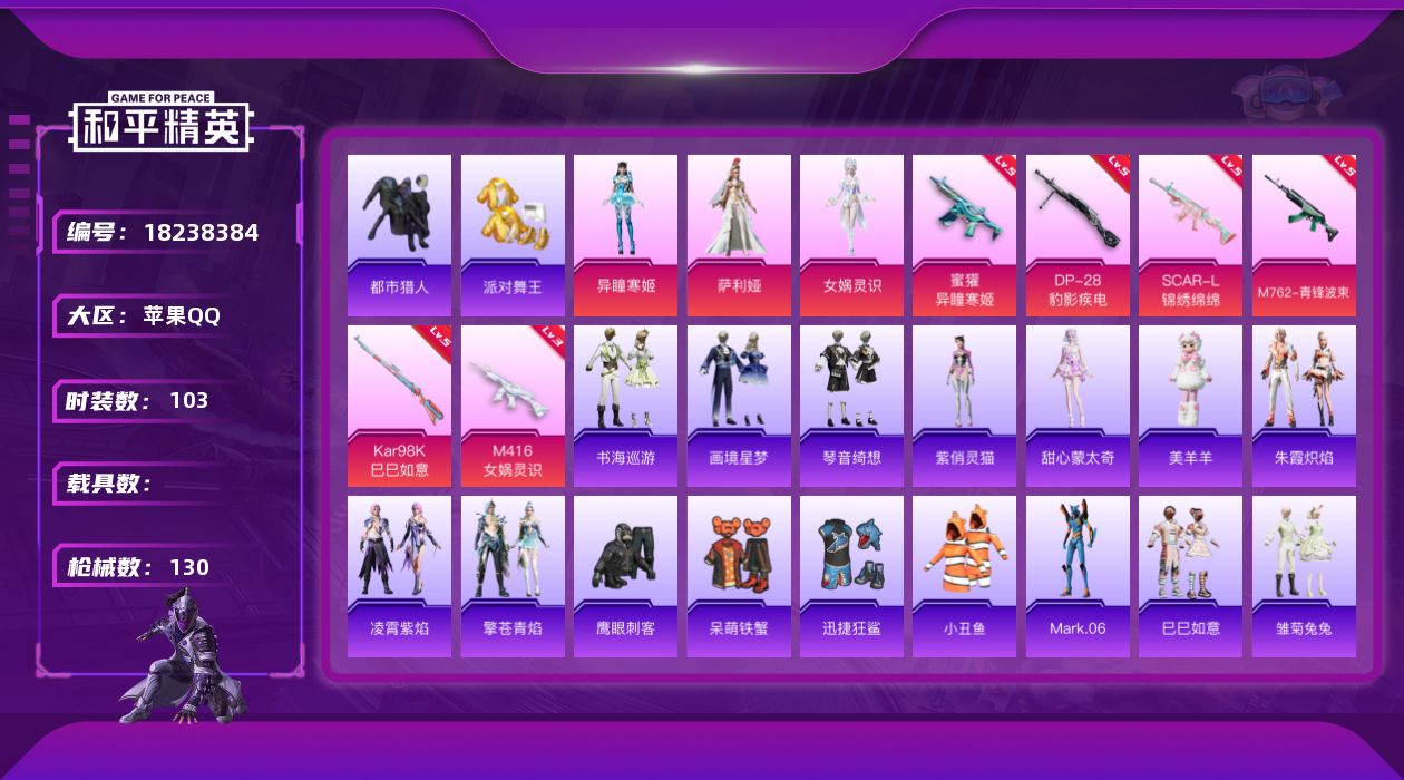103套装/枪械2/装备131/载具1/战备84/王牌印记4/热力值39055/
