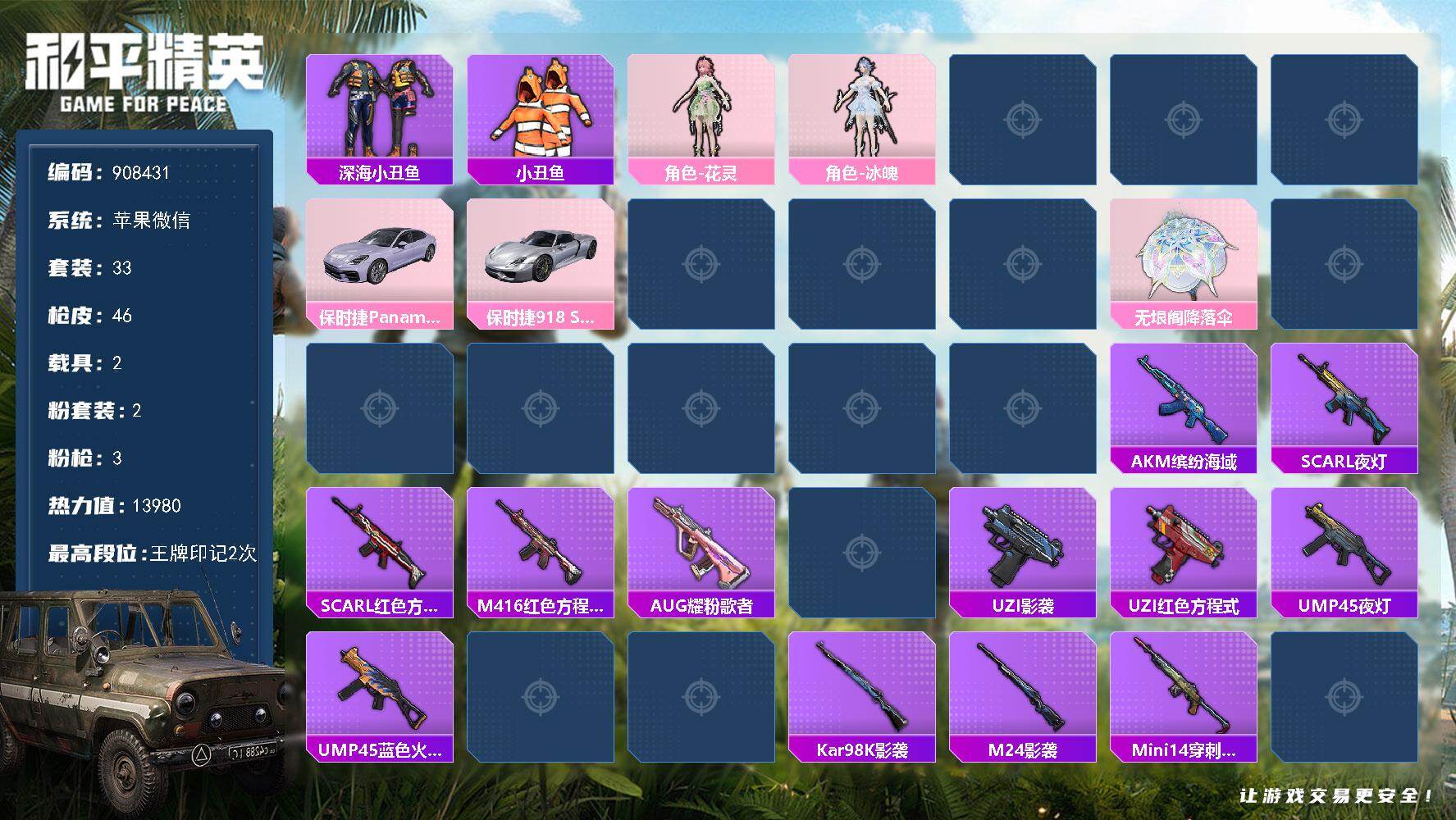 2粉装-3特效枪-2载具-1粉色飞行器-13980热力值-2王牌印记-33套装-46枪皮