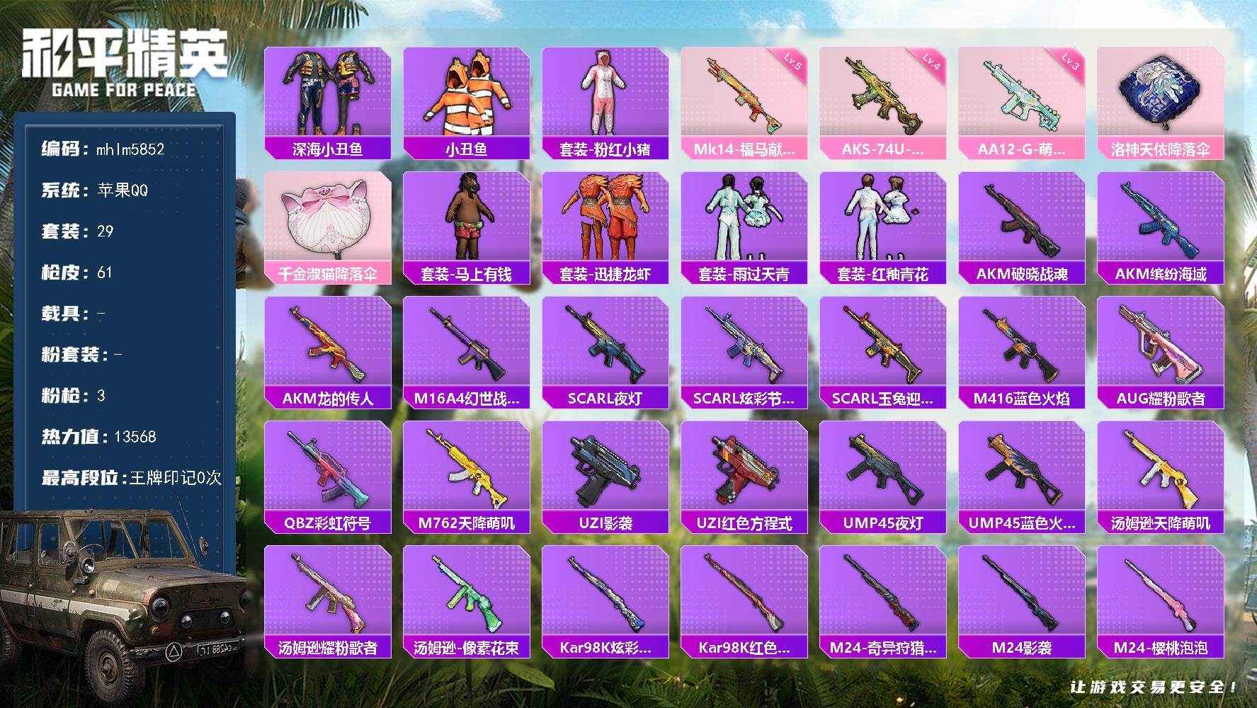 【mhp1196】苹果 微信-0粉装-4特效枪-0载具-0粉色飞行器-1664