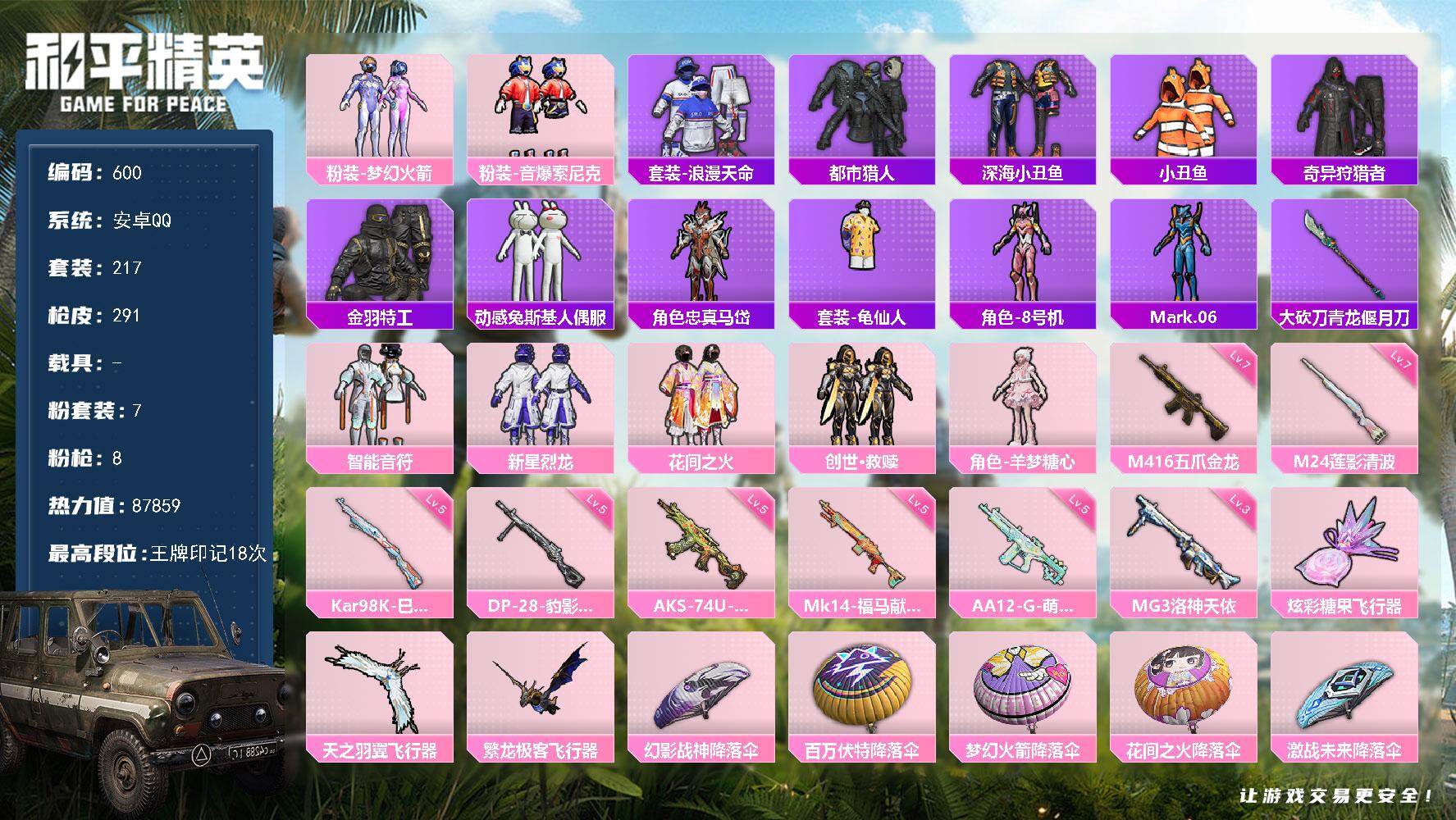 安卓 手Q-7粉装-8特效枪-0载具-3粉色飞行器-87859热力值-18王牌