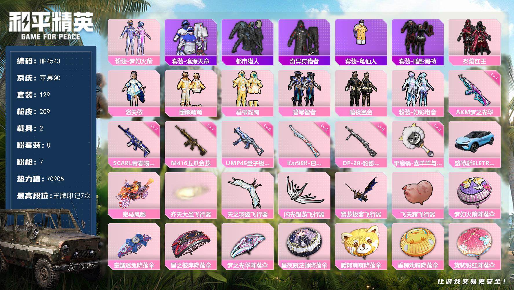 苹果 手Q-3粉装-5特效枪-2载具-2粉色飞行器-66369热力值-14王牌