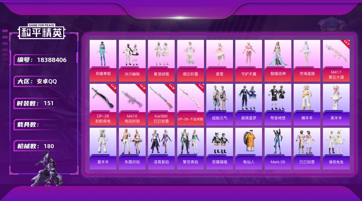 时装数: 312 载具数: 1 枪械数: 85 战备数: 64 热门装扮: 蝶