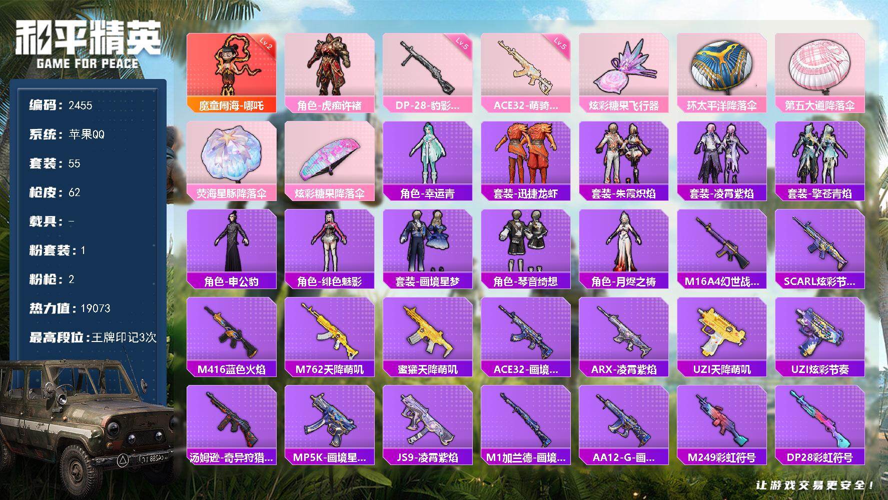 1神装-1粉装-2特效枪-0载具-1粉色飞行器-19073热力值-3王牌印记-55套装-62枪皮