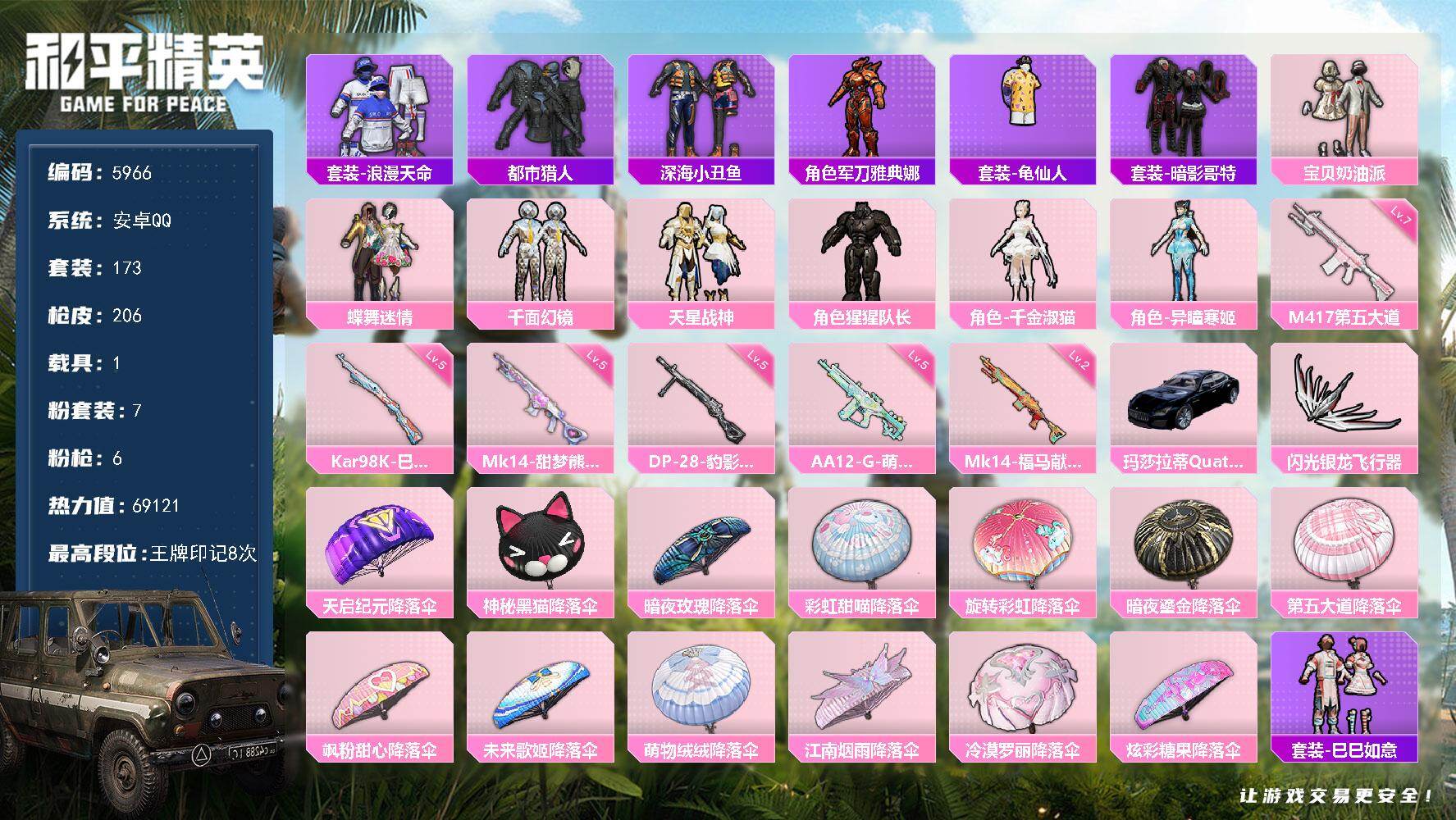 173套装/枪械6/装备267/载具1/战备147/王牌印记8/热力值69121