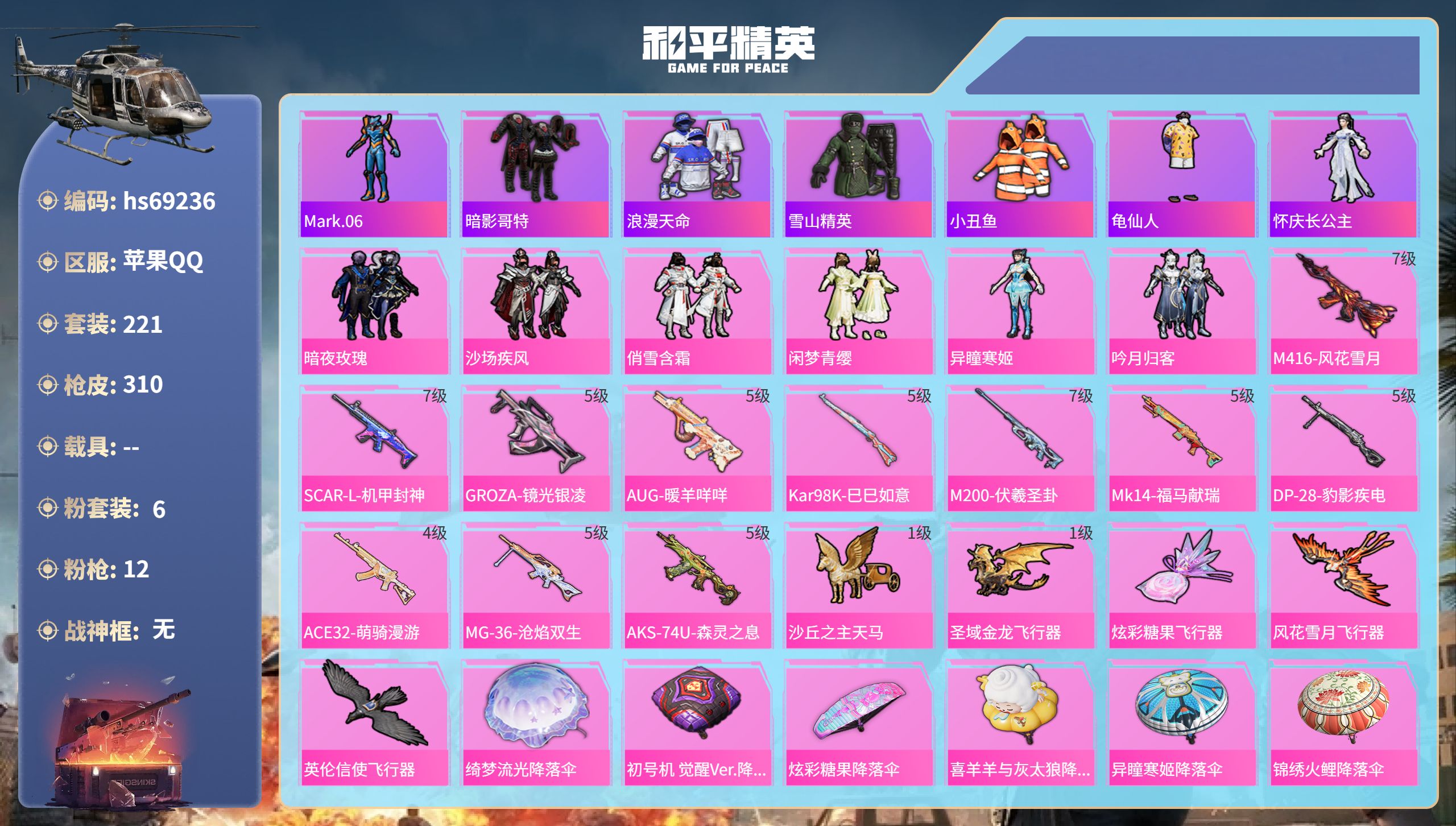 hs41296 苹果微-2王牌印记-0粉装-3特效枪-1载具-24611热力值-35套装-73枪皮