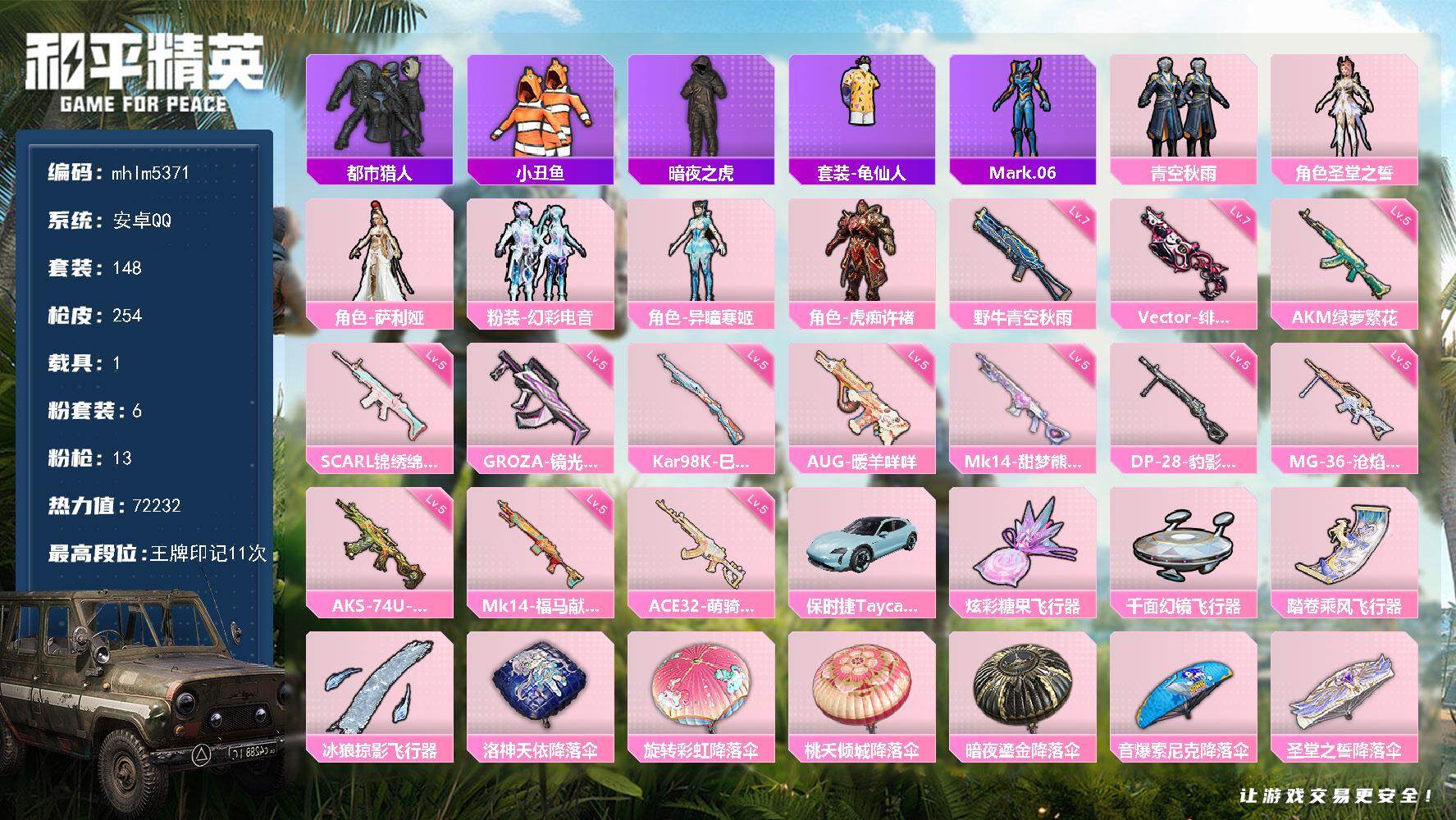 6粉装-13特效枪-1载具-4粉色飞行器-72232热力值-11王牌印记-148套装-254枪皮