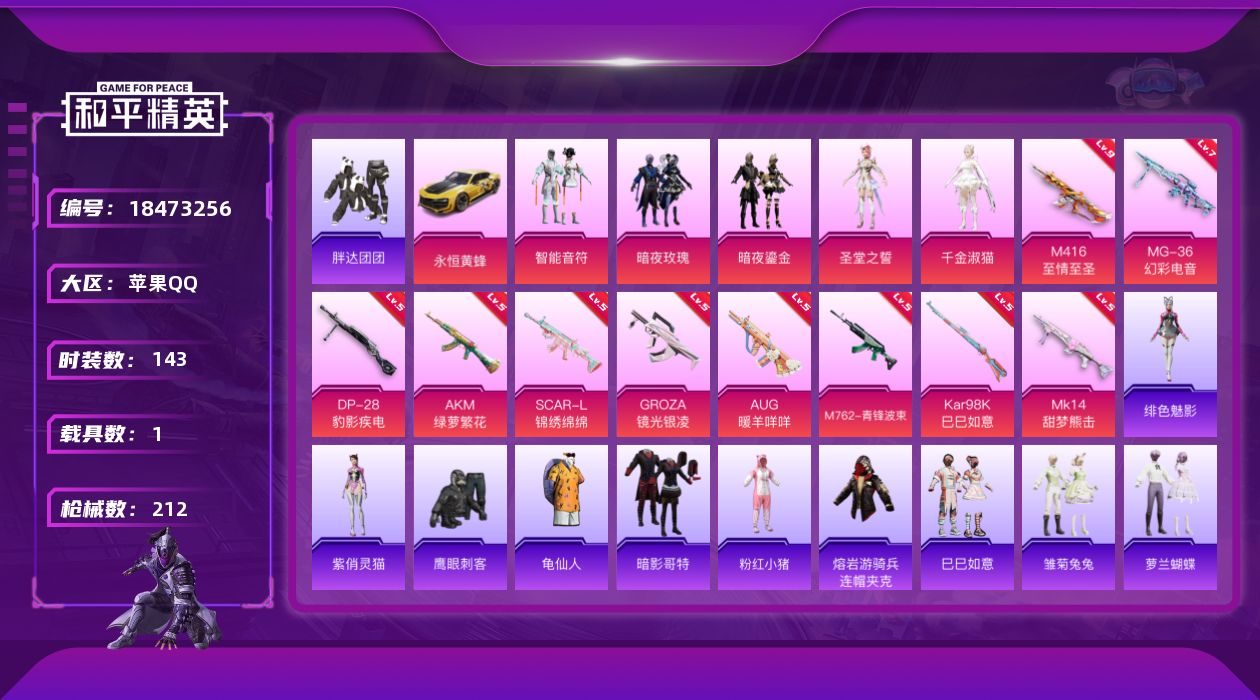 苹果 手Q-2粉装-3特效枪-0载具-2粉色飞行器-76211热力值-18王牌印