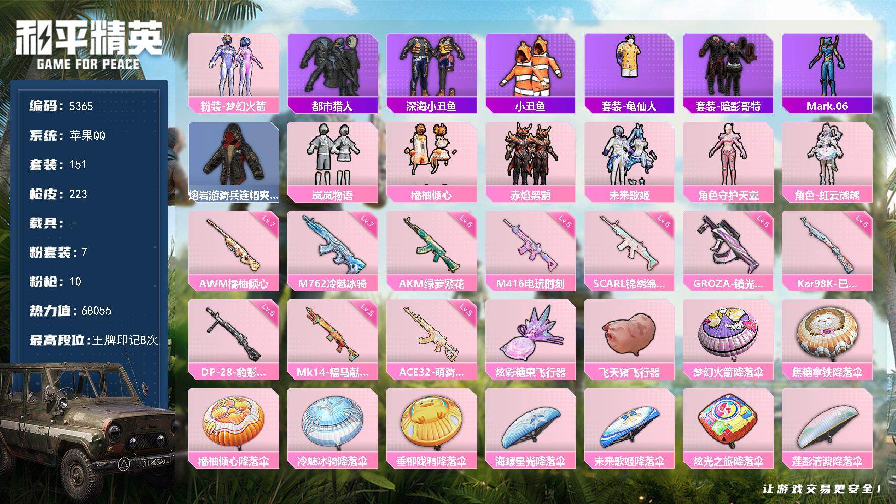 和平精英|载具4辆丨30套粉装|7把粉枪丨王牌10星丨无违规记录