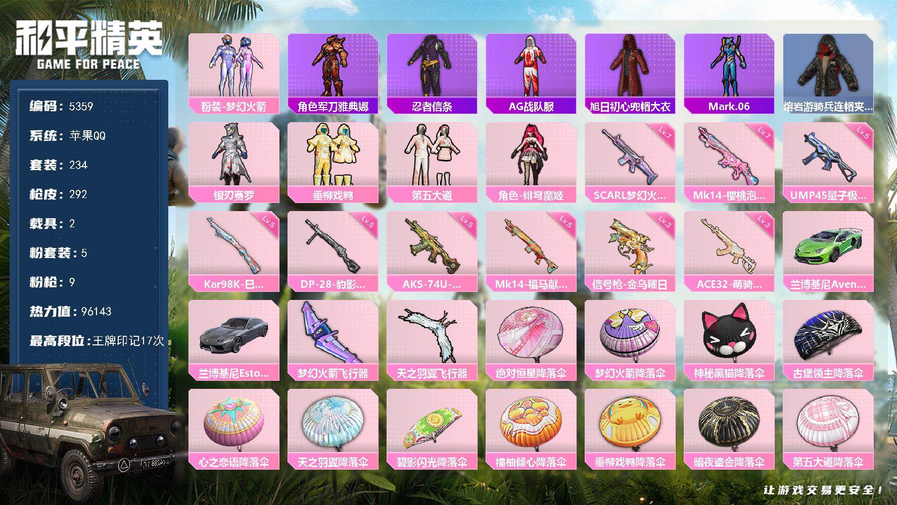 5粉装-9特效枪-2载具-2粉色飞行器-96143热力值-17王牌印记-234套装-292枪皮