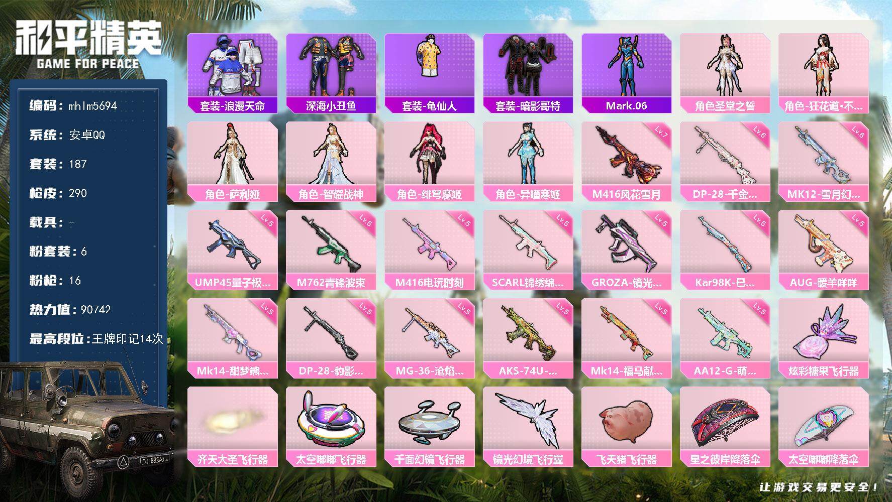 【mhlm5694】安卓 手Q-6粉装-16特效枪-0载具-7粉色飞行器-90