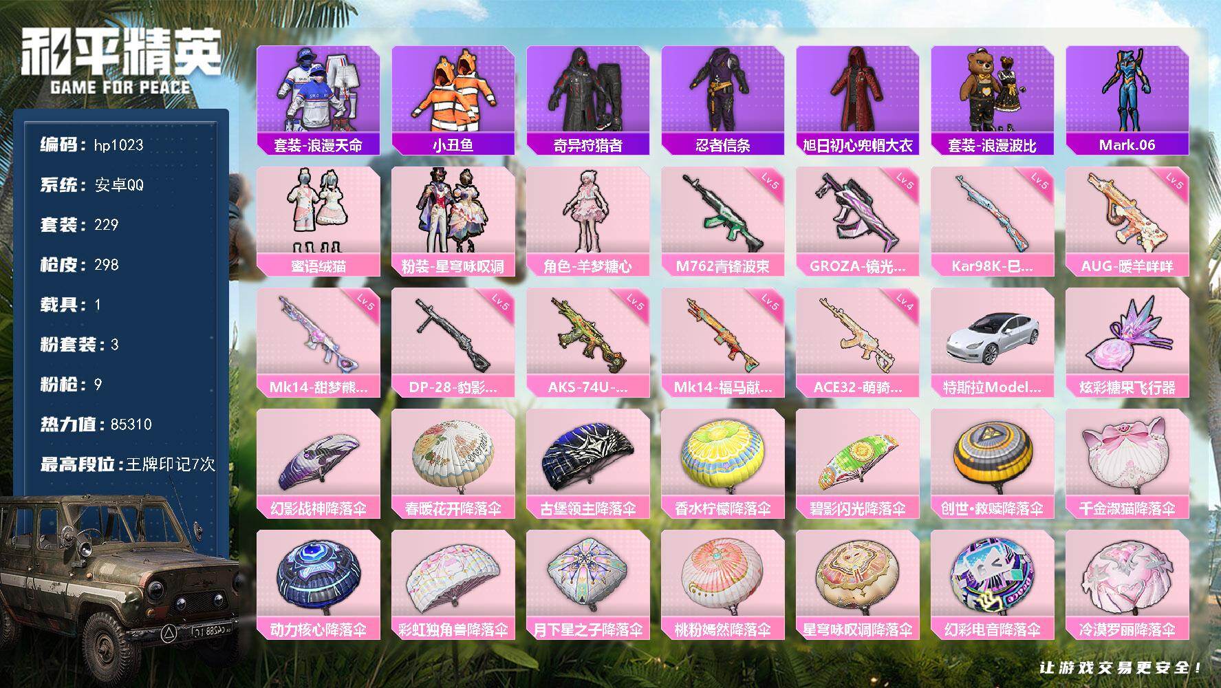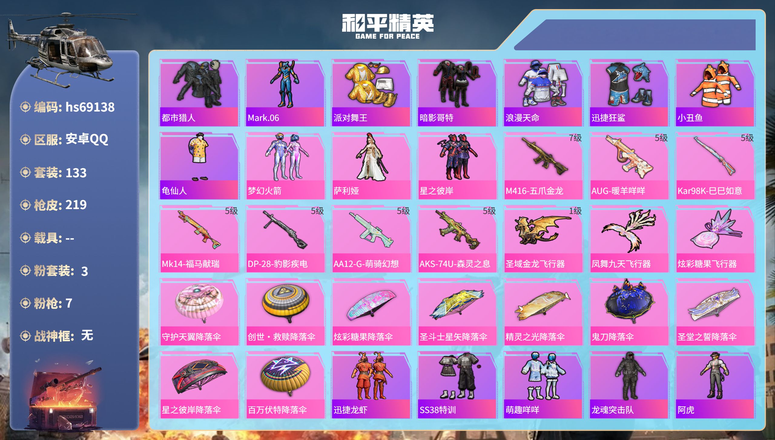 安卓 手Q-9粉装-6特效枪-0载具-3粉色飞行器-59033热力值-9王牌印记