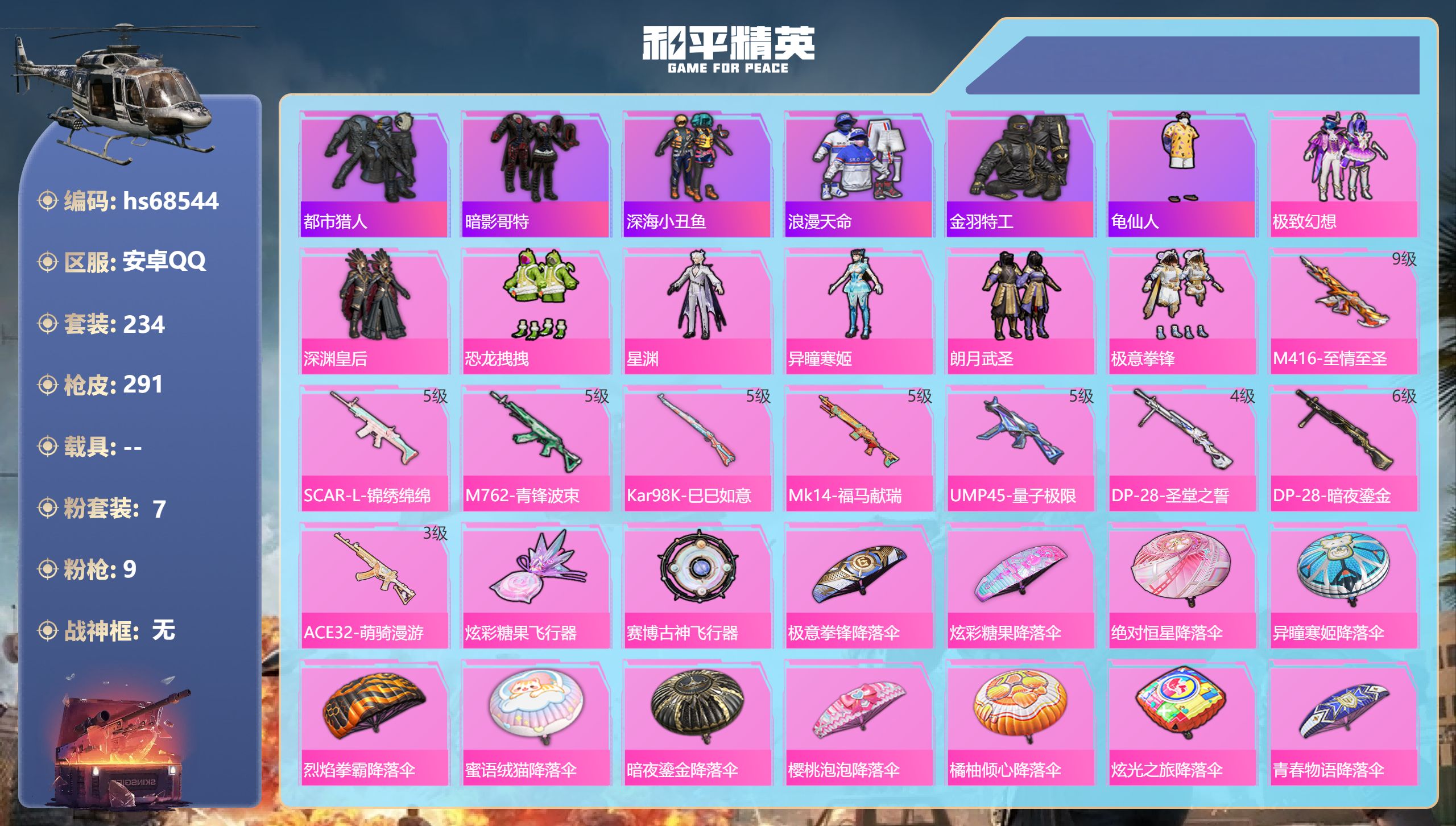 7王牌印记-1红装-1粉装-6特效枪-2载具-60435热力值-152套装-204枪皮