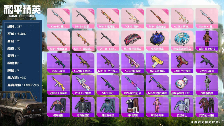 2粉装-5特效枪-0载具-1粉色飞行器-18361热力值-1王牌印记-55套装-74枪皮