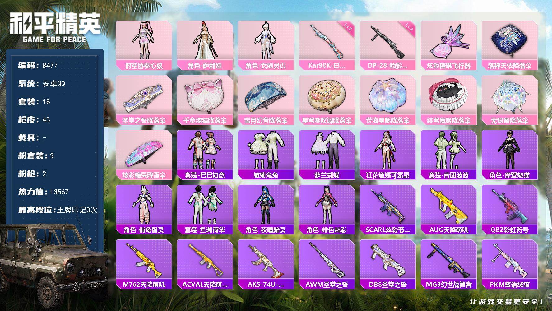 【8477】3粉装-2特效枪-0载具-1粉色飞行器-13567热力值-0王牌印