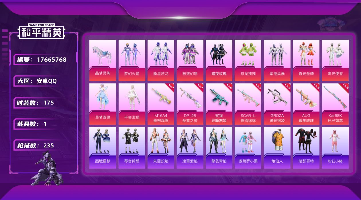 安卓 手Q-6粉装-9特效枪-1载具-1粉色飞行器-56497热力值-9王牌印记