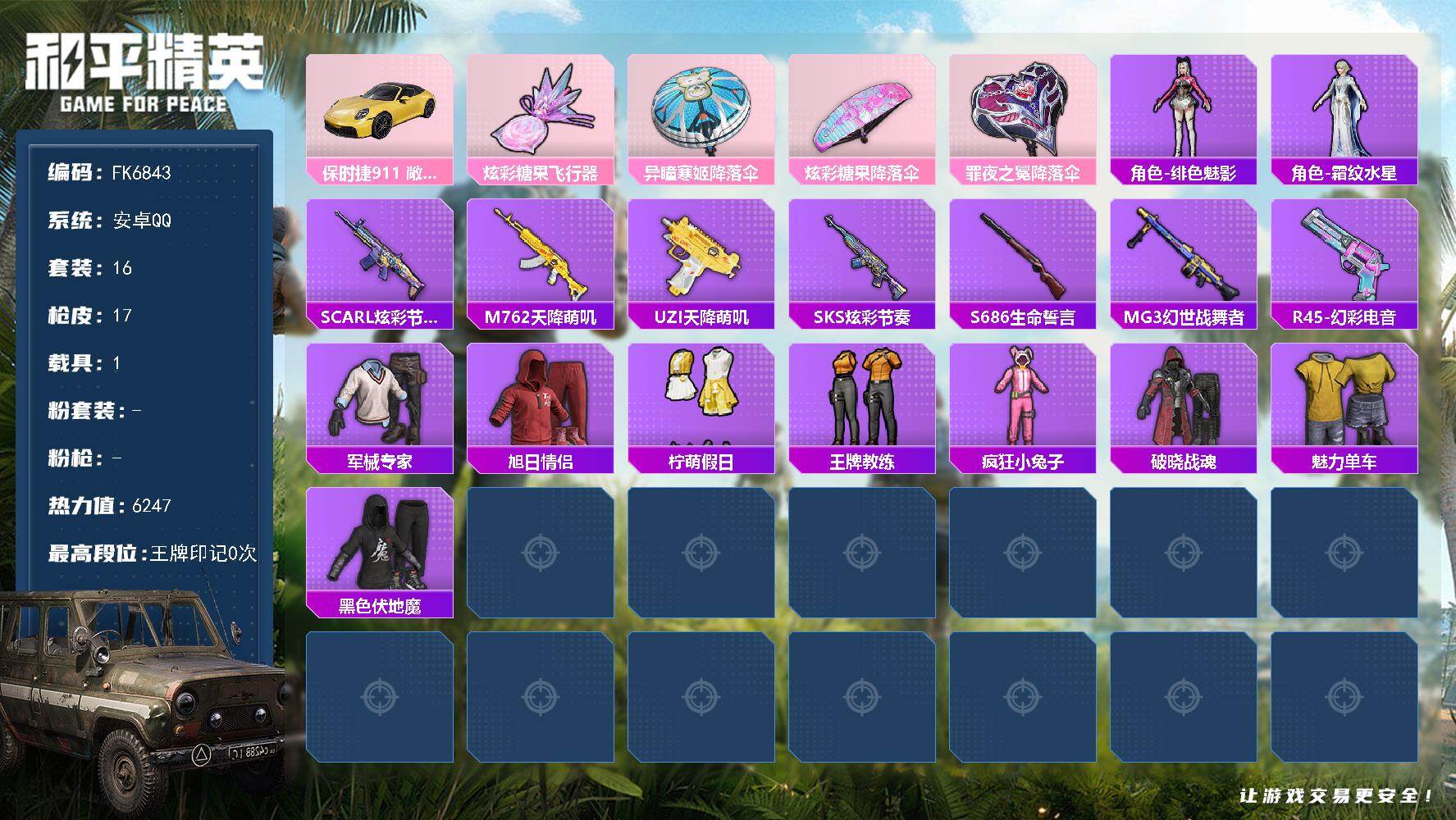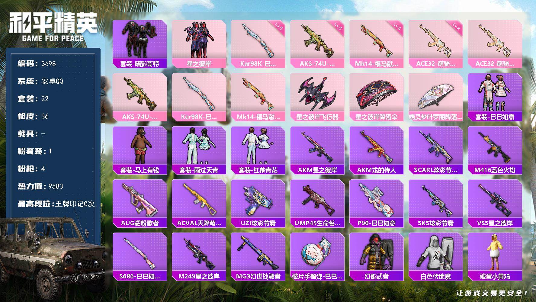 安卓 手Q-0粉装-0特效枪-0载具-0粉色飞行器-22314热力值-1王牌印记