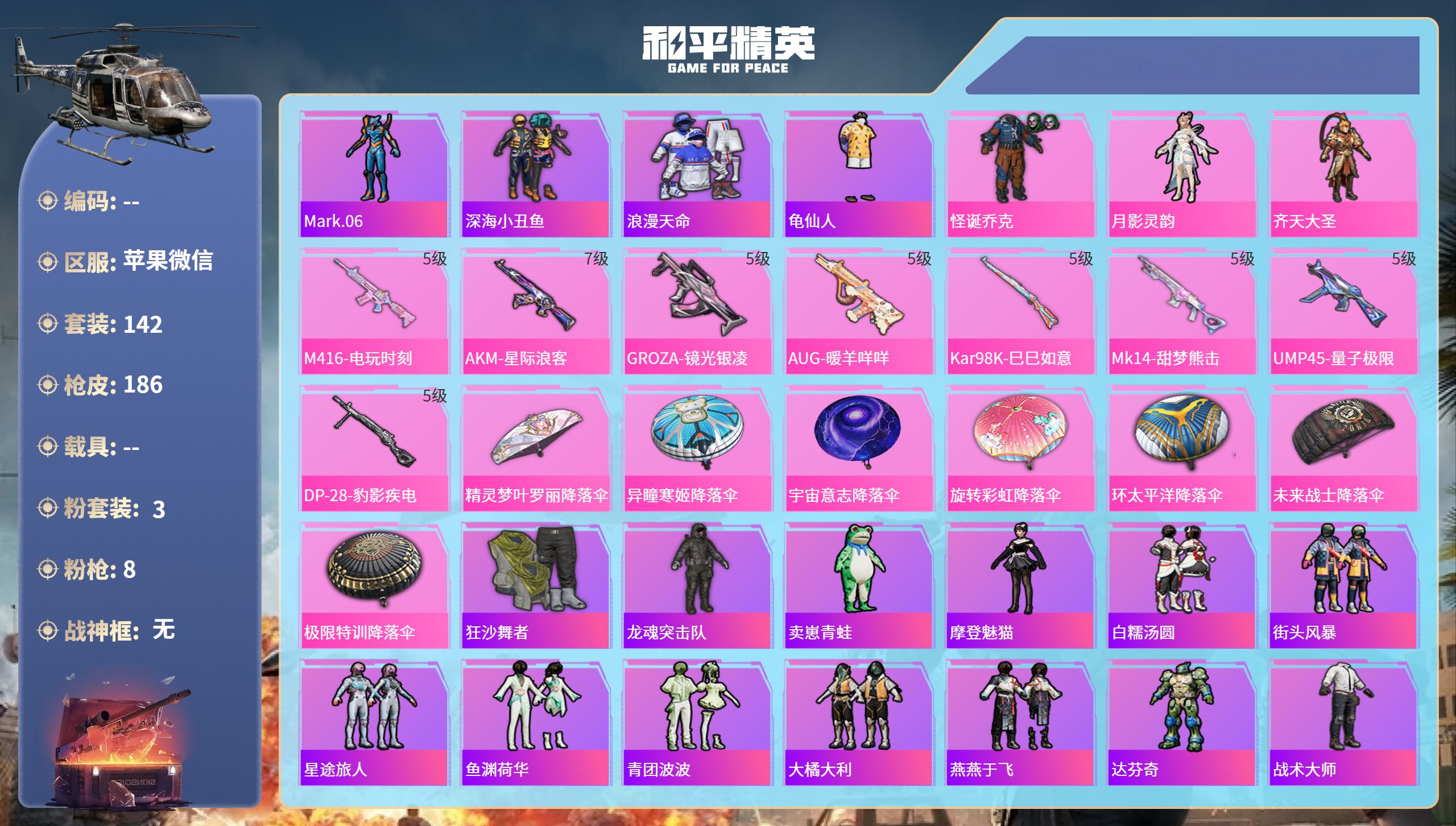 满级地铁 苹果 手Q-5粉装-12特效枪-1载具-4粉色飞行器-87971热力值