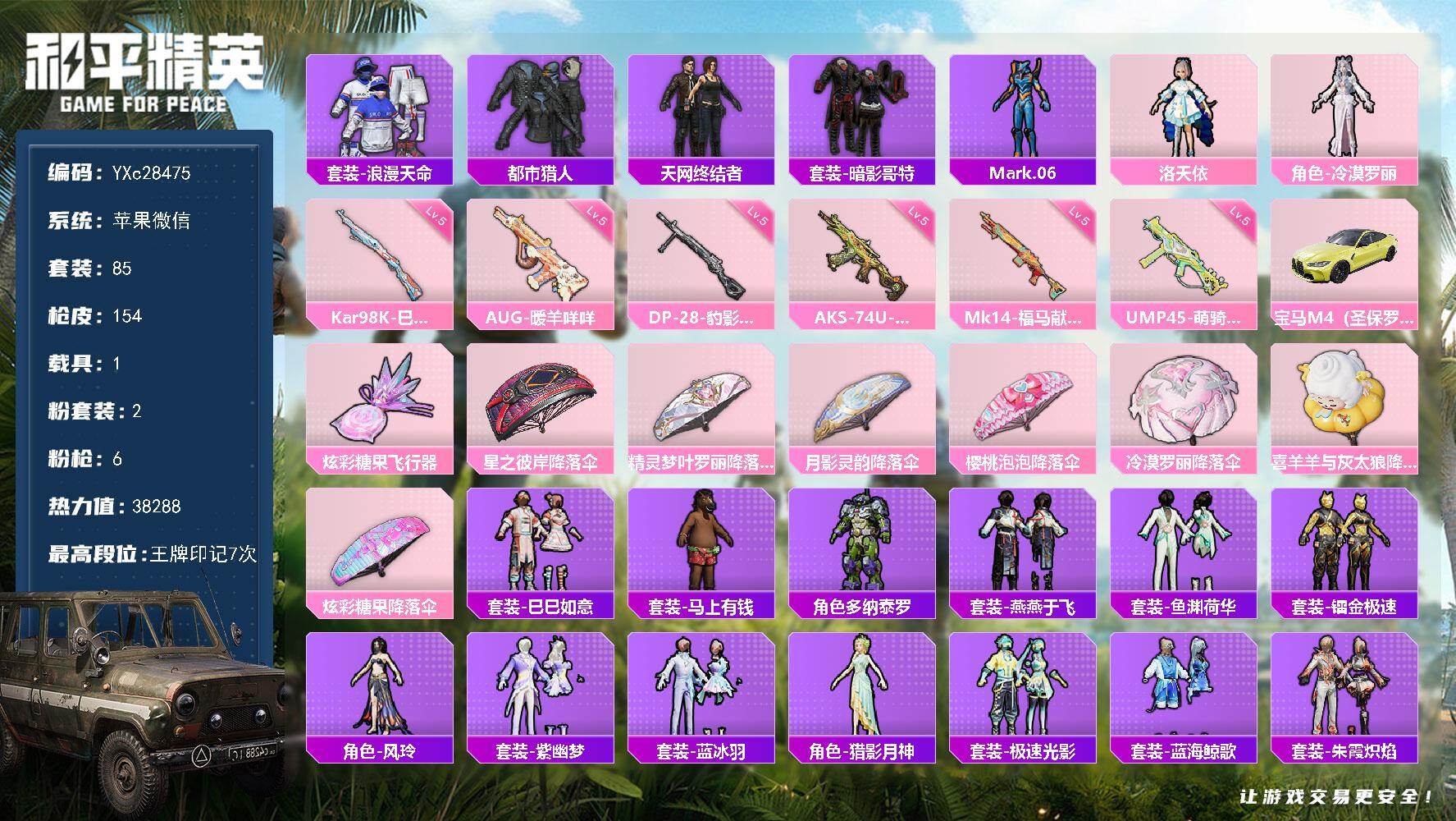 苹果 手Q-4粉装-10特效枪-0载具-2粉色飞行器-51284热力值-9王牌印