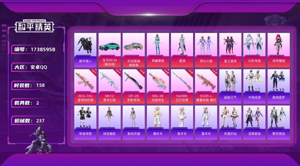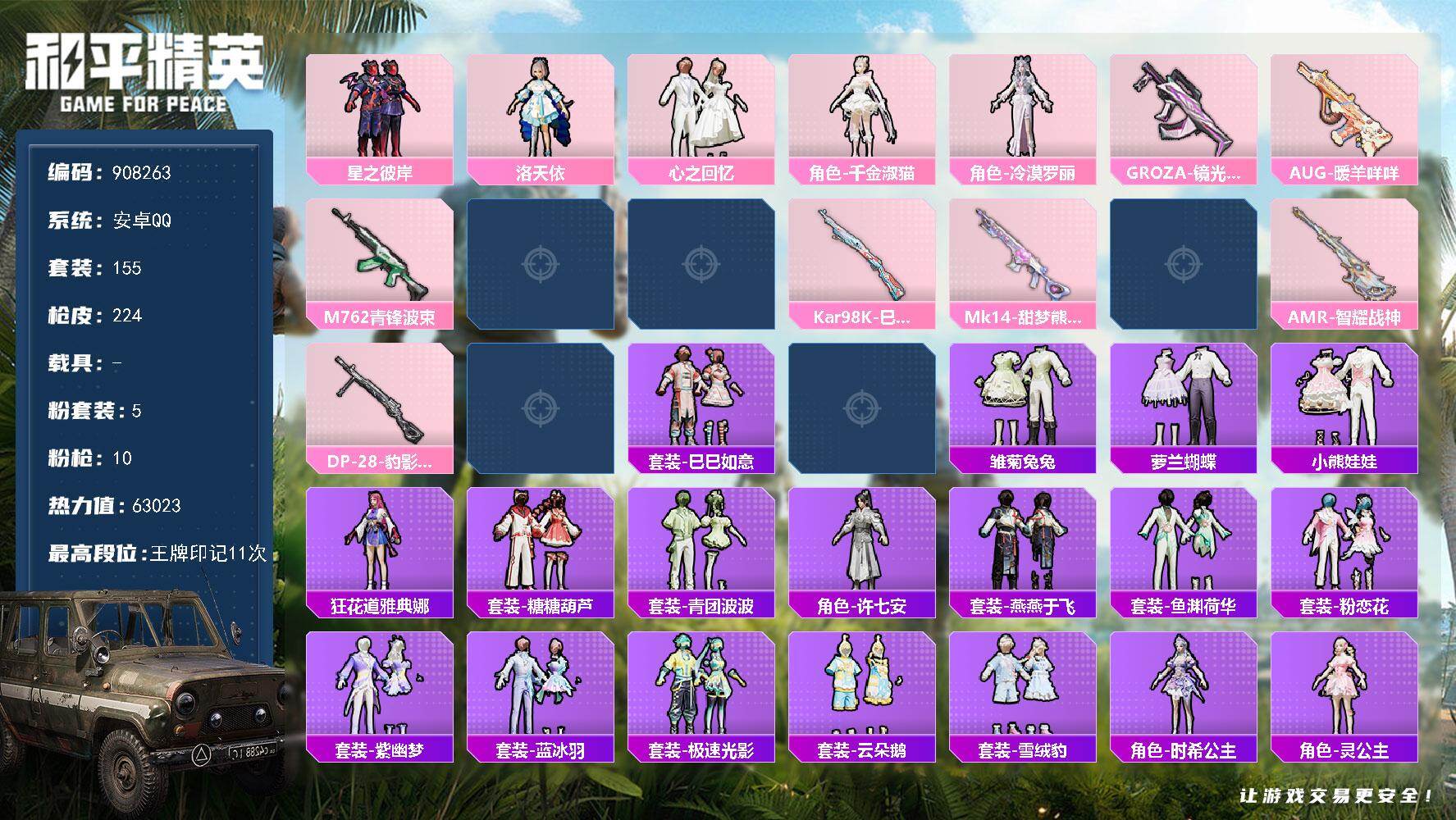 a4342/安卓QQ/10王牌印记-8粉装-6特效枪-3载具-76008热力值-169套装-247枪