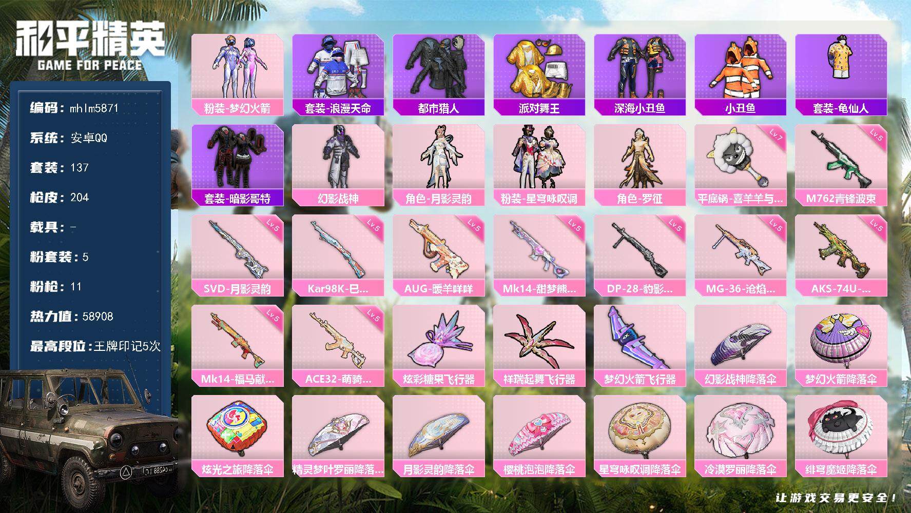 5粉装-11特效枪-0载具-3粉色飞行器-58908热力值-5王牌印记-137套装-204枪皮