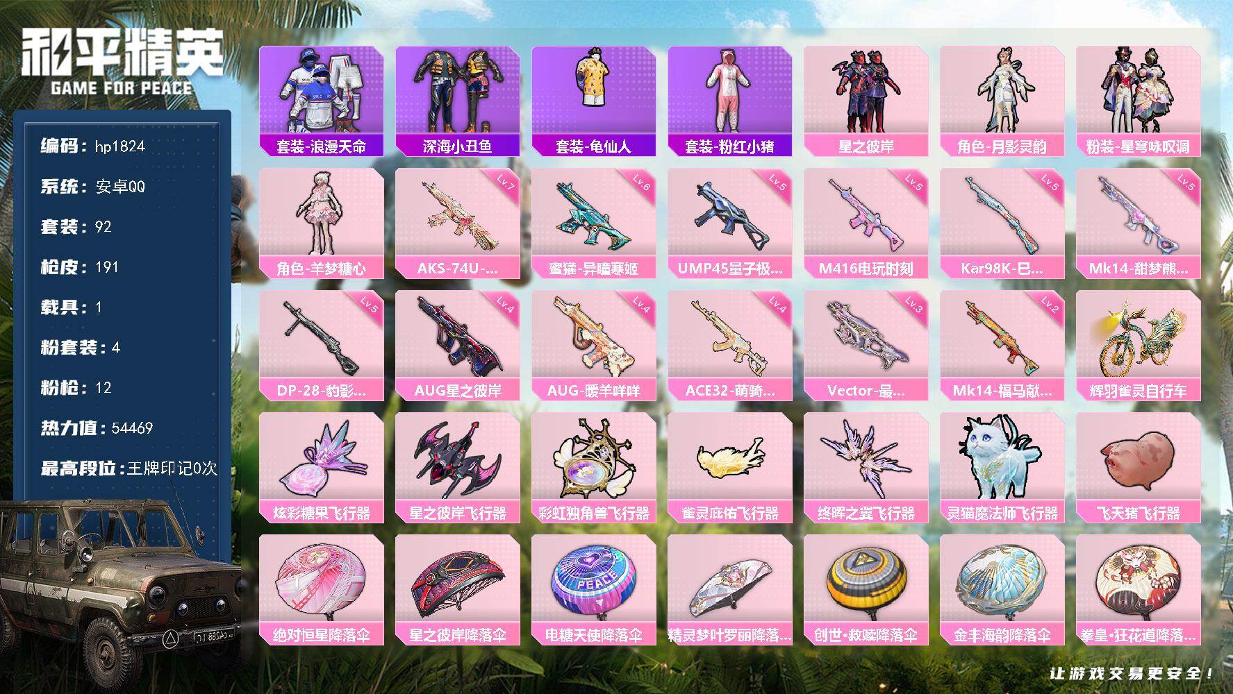 安卓 手Q-4粉装-12特效枪-1载具-7粉色飞行器-54469热力值-1王牌印