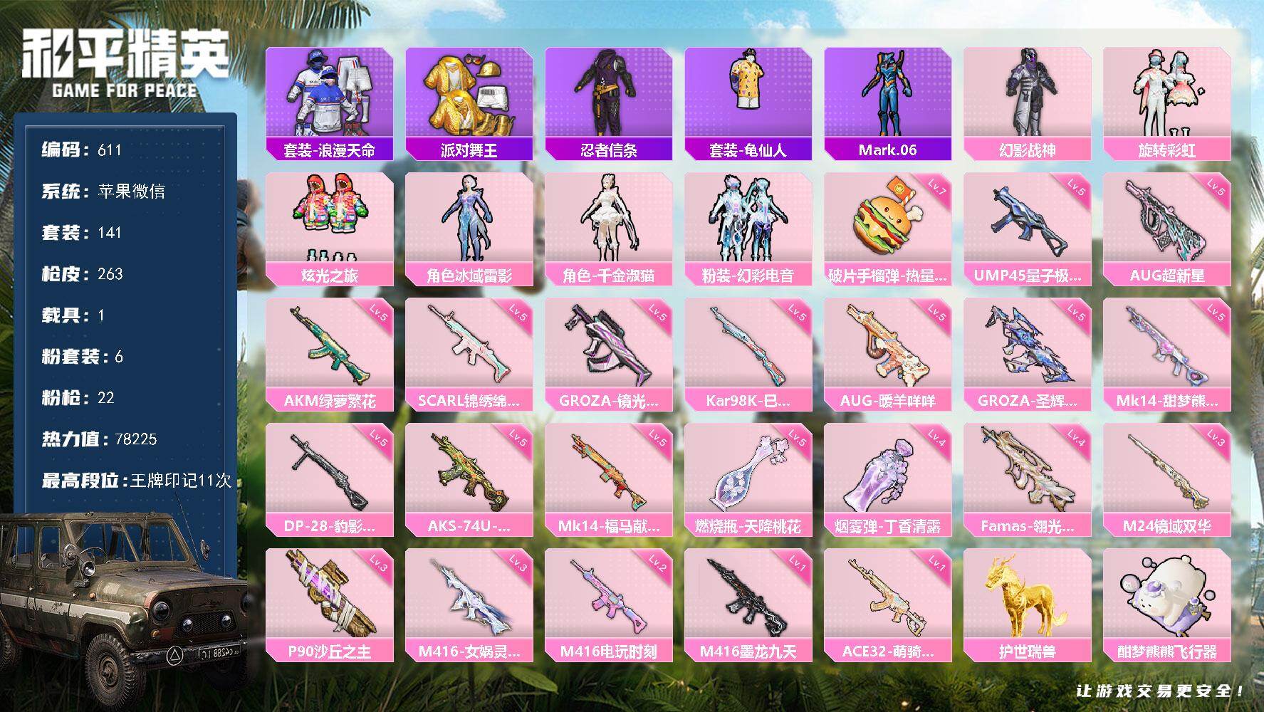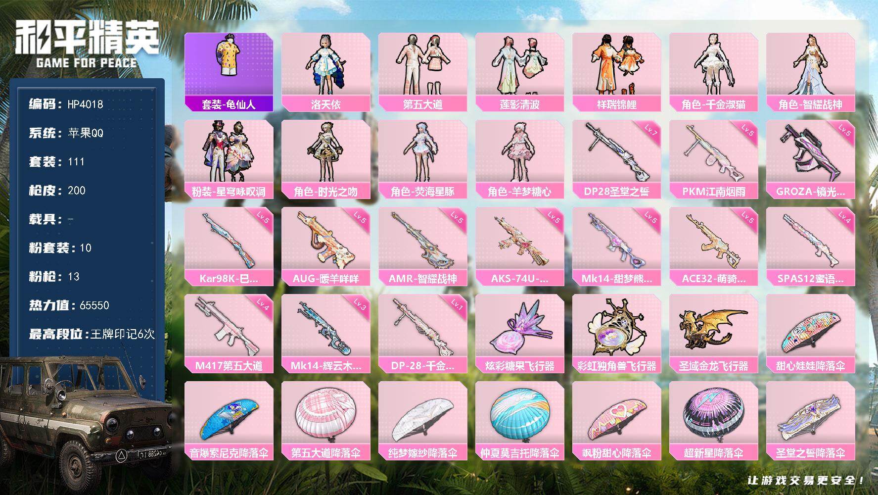 a4272/安卓QQ/9王牌印记-16粉装-5特效枪-2载具-65406热力值-139套装-174枪