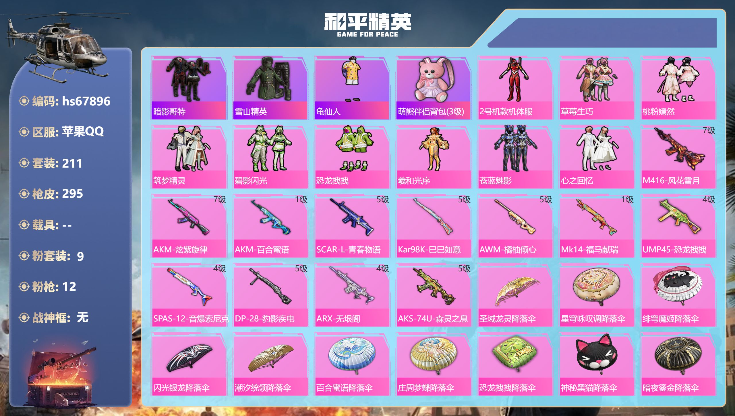 10粉装-14特效枪-0载具-2粉色飞行器-67956热力值-8王牌印记-154套装-226枪皮