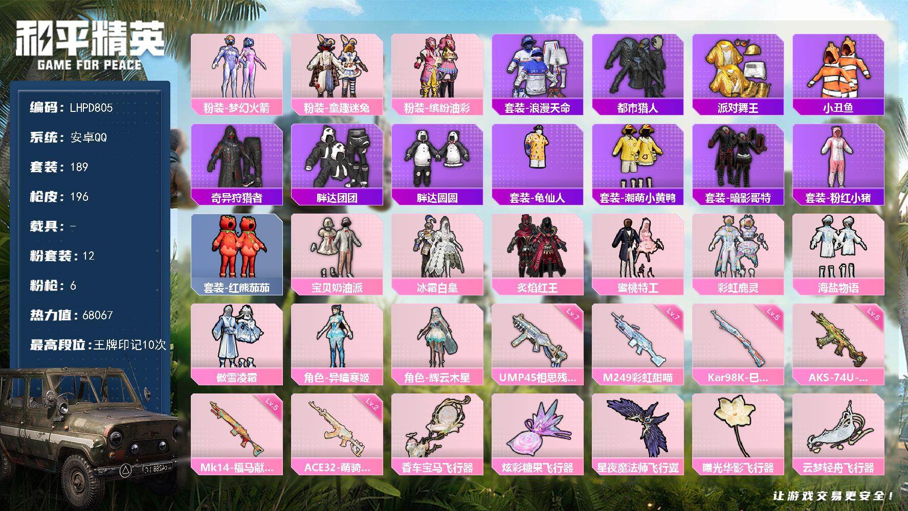 安卓 手Q-4粉装-8特效枪-2载具-2粉色飞行器-43271热力值-10王牌印
