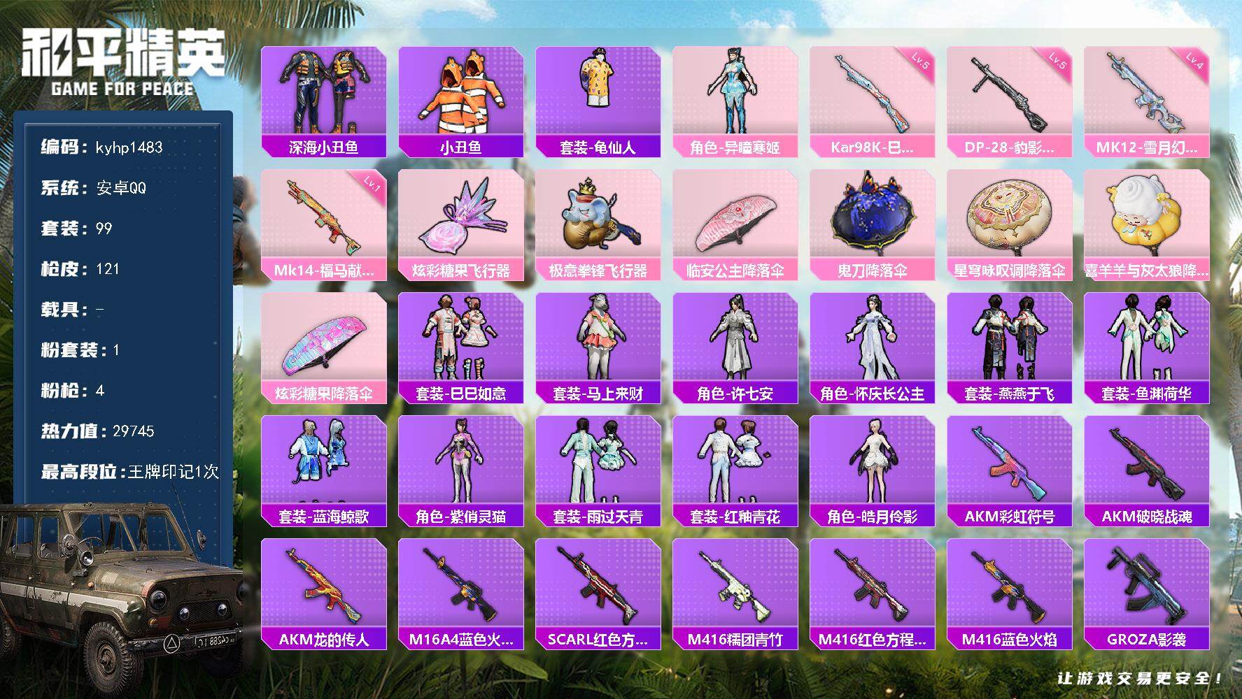 安卓 手Q-1粉装-4特效枪-0载具-2粉色飞行器-29745热力值-1王牌印