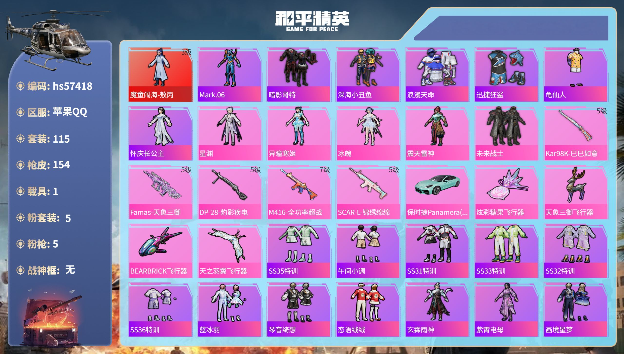 hs57418 苹果手Q-9王牌印记-1红装-5粉装-5特效枪-1载具-49317热力值-115套装