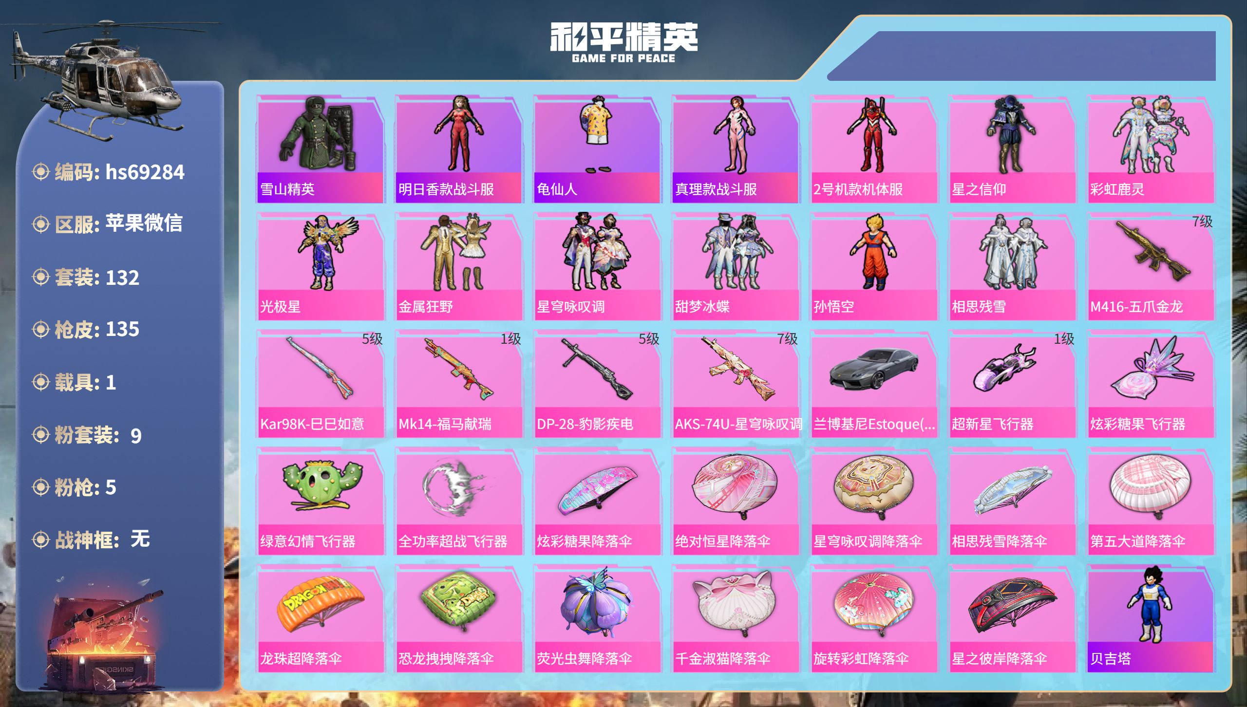 苹果 手Q-9粉装-7特效枪-1载具-5粉色飞行器-68300热力值-12王牌