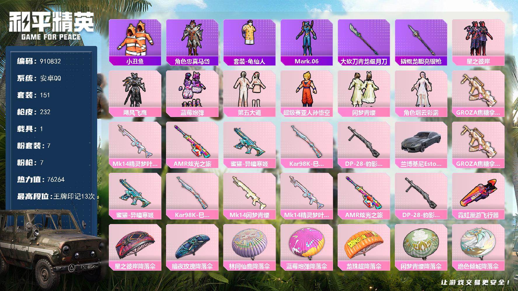 安卓 手Q-8粉装-4特效枪-3载具-2粉色飞行器-80136热力值-17王牌