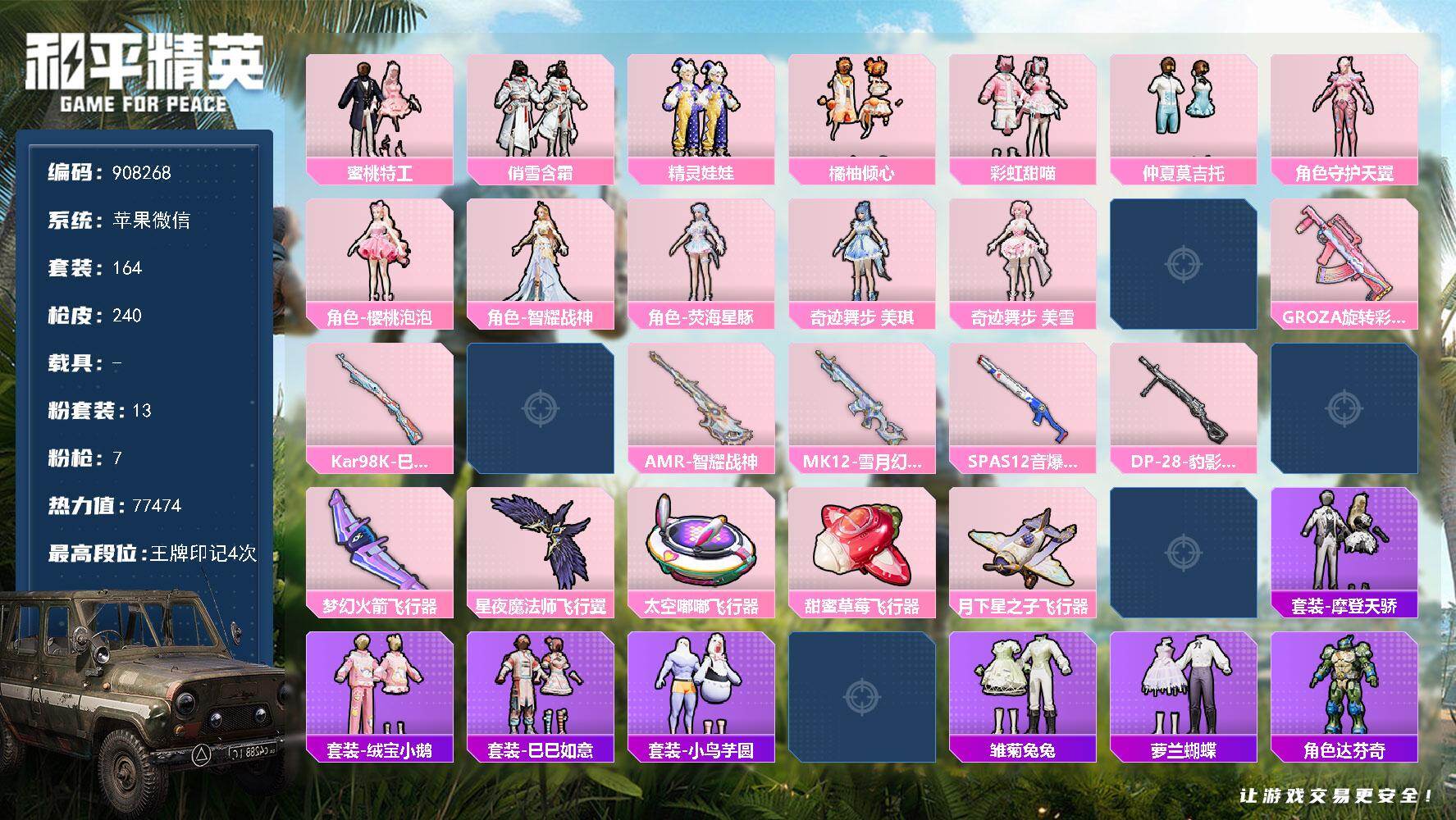 4粉装-10特效枪-2载具-0粉色飞行器-42049热力值-7王牌印记-88套装-124枪皮