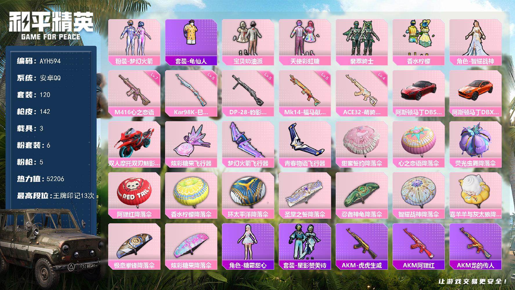 6粉装-5特效枪-3载具-3粉色飞行器-52206热力值-13王牌印记-120套装-142枪皮