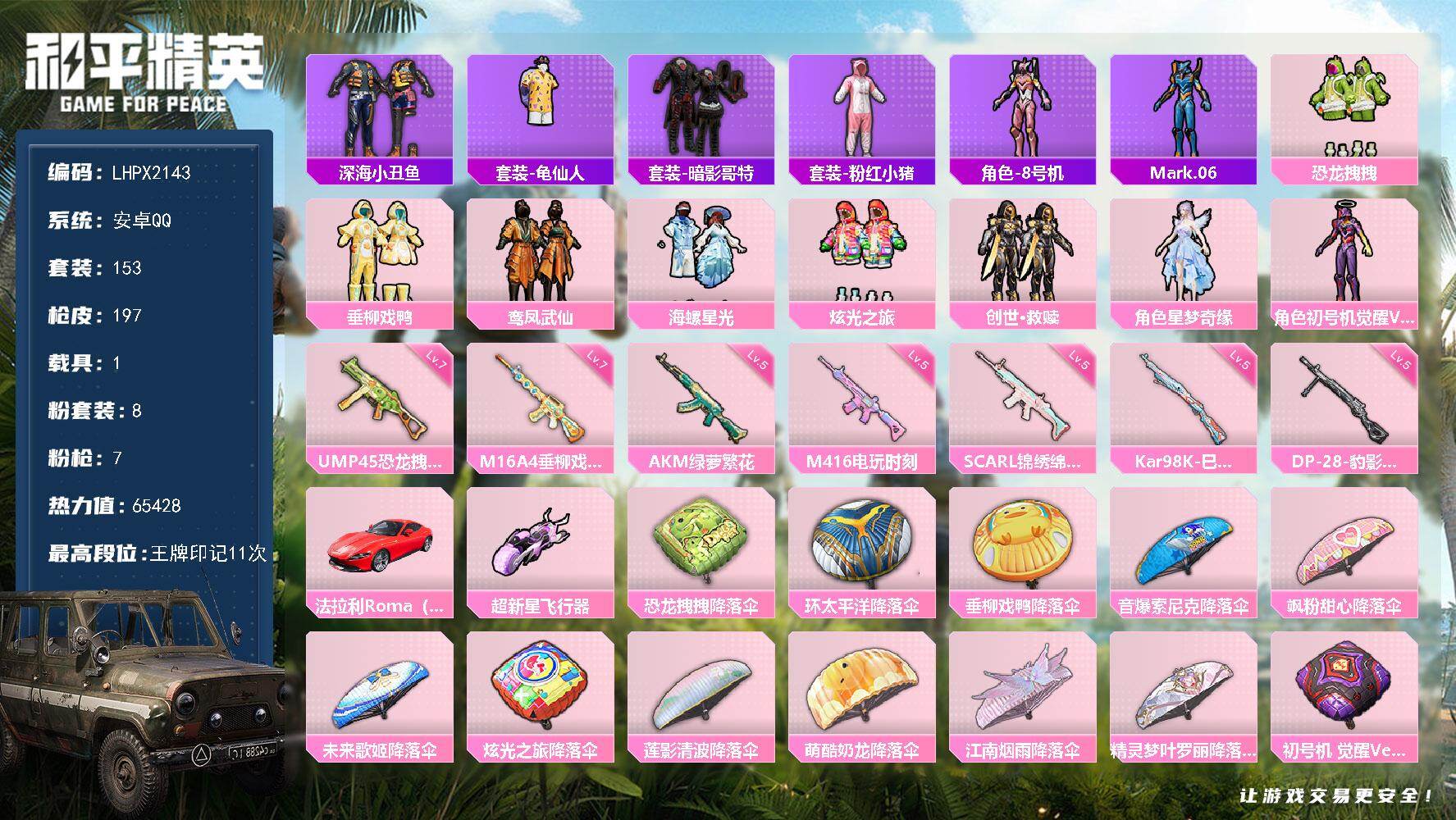 8粉装-7特效枪-1载具-2粉色飞行器-65428热力值-11王牌印记-153套装-197枪皮