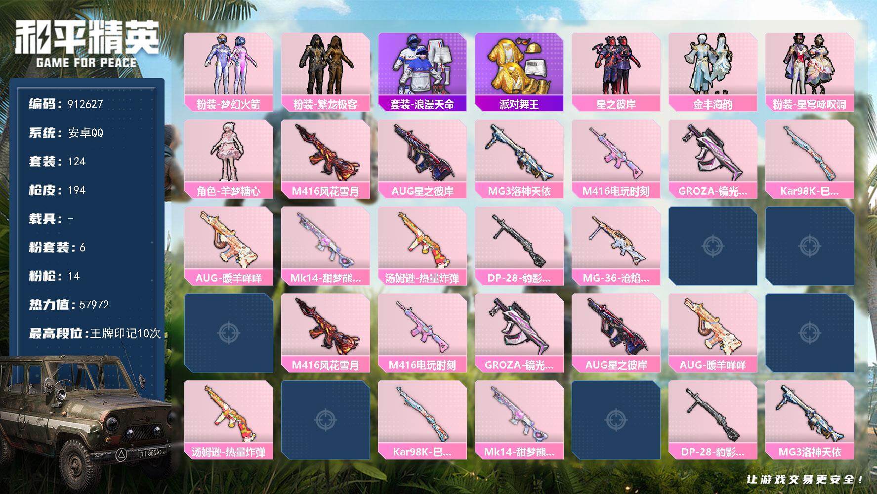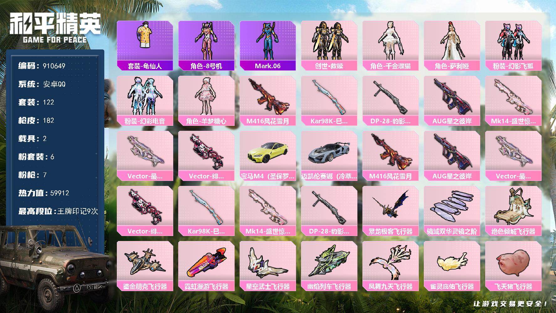 122套装/枪械7/装备295/载具2/战备139/王牌印记9/热力值59912/