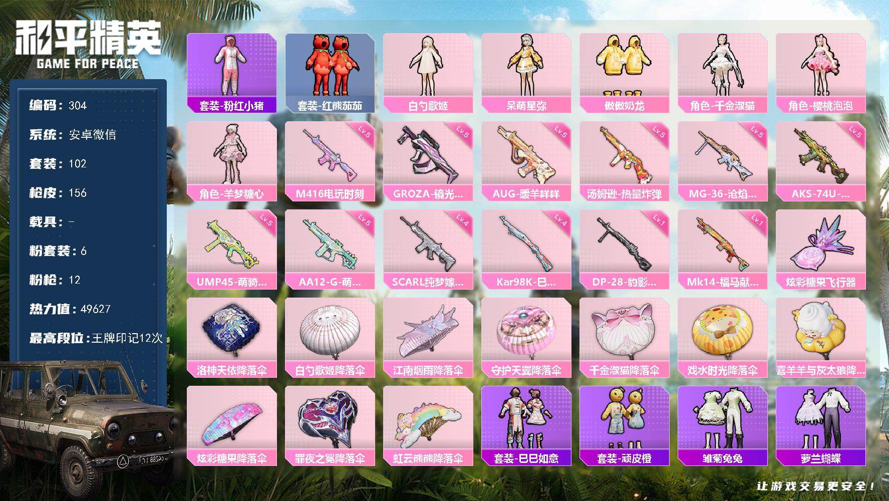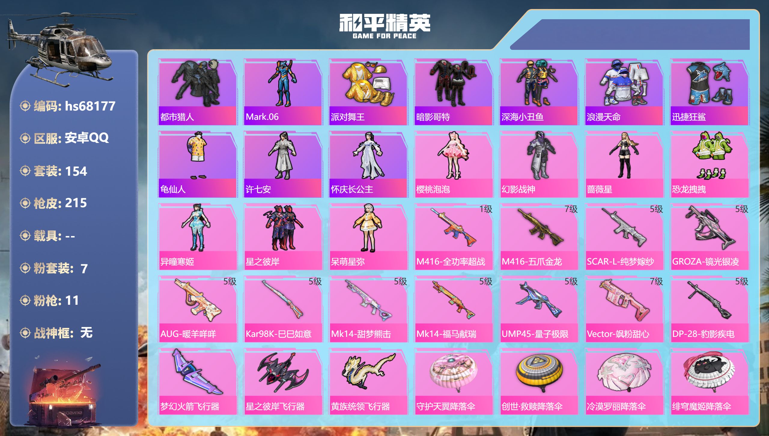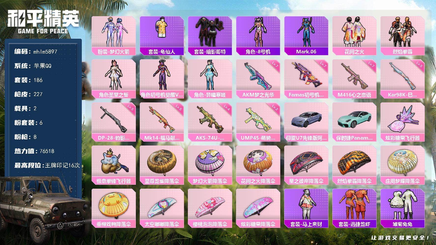 6粉装-8特效枪-2载具-2粉色飞行器-76518热力值-16王牌印记-186套装-227枪皮