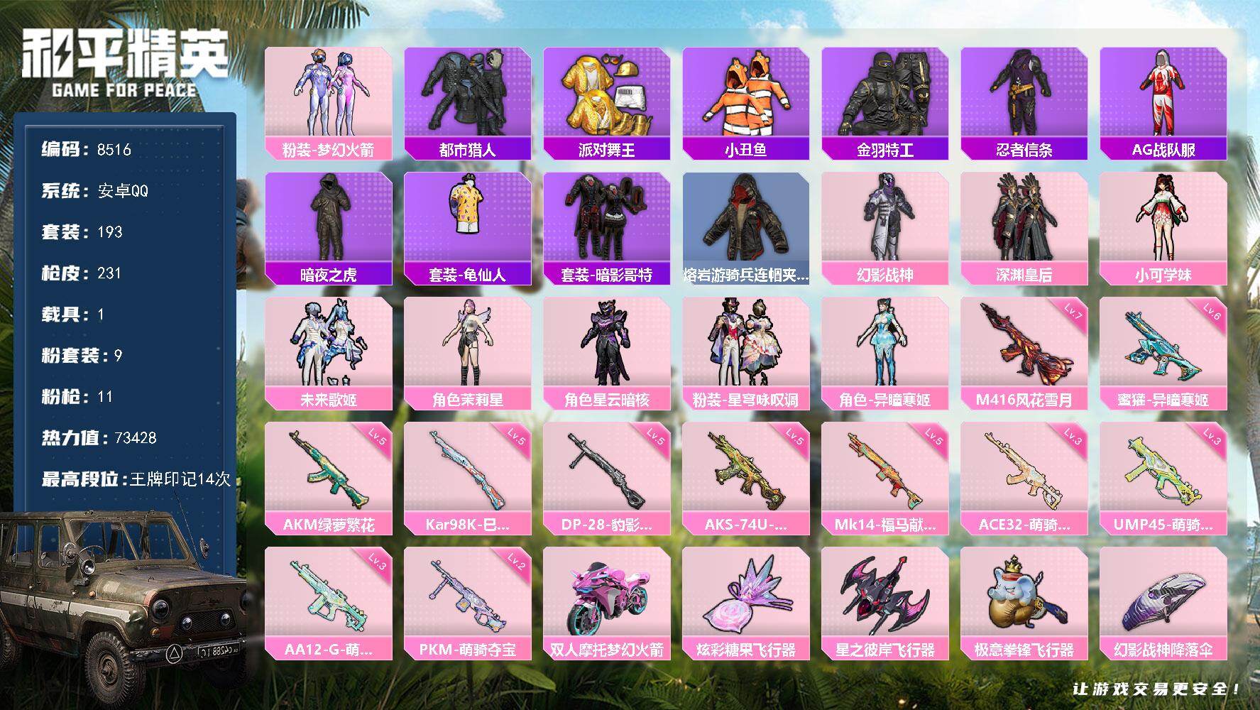 【8516】9粉装-11特效枪-1载具-3粉色飞行器-73428热力值-14王