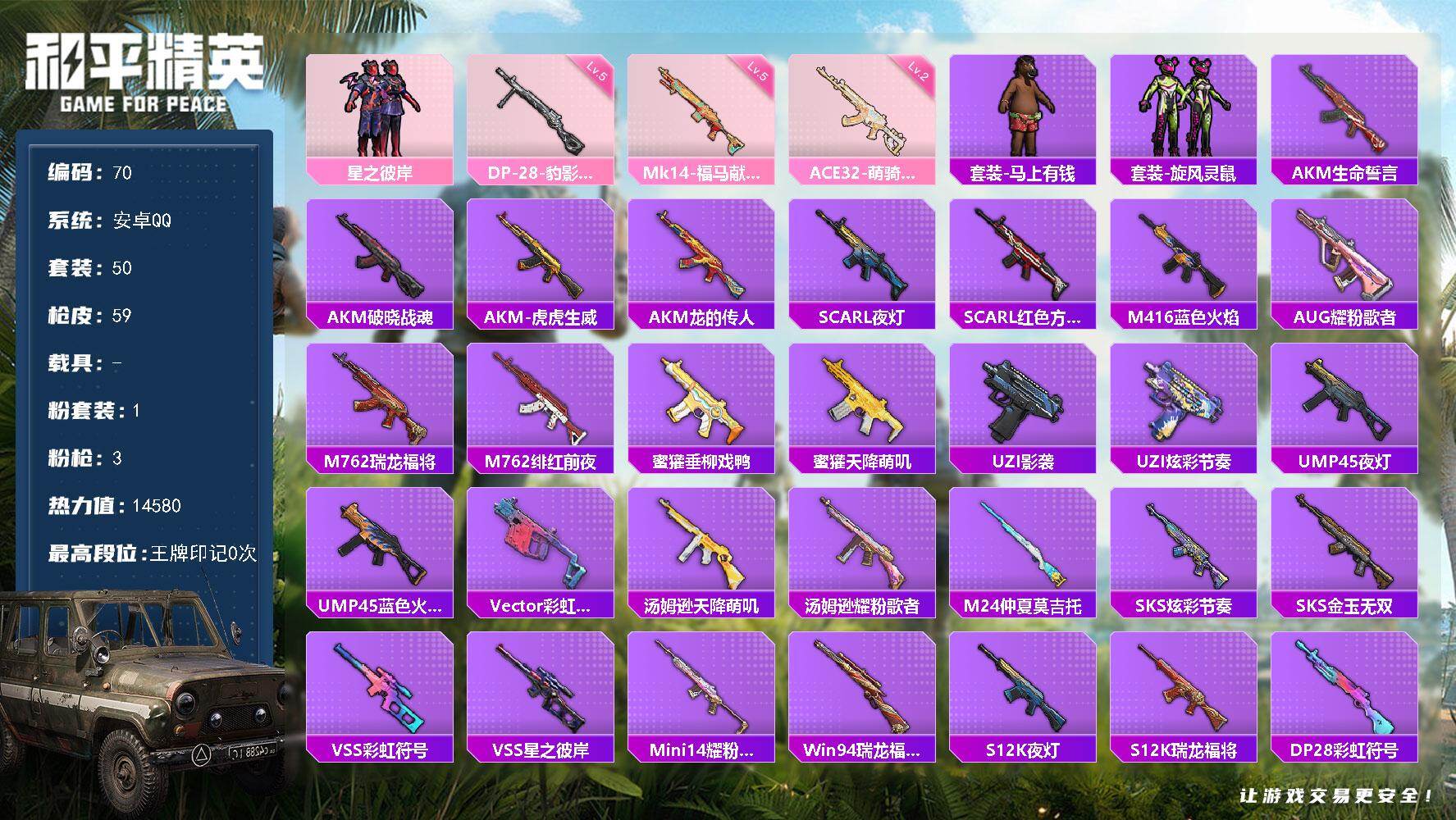 安卓 手Q-1粉装-5特效枪-0载具-1粉色飞行器-20335热力值-2王牌印