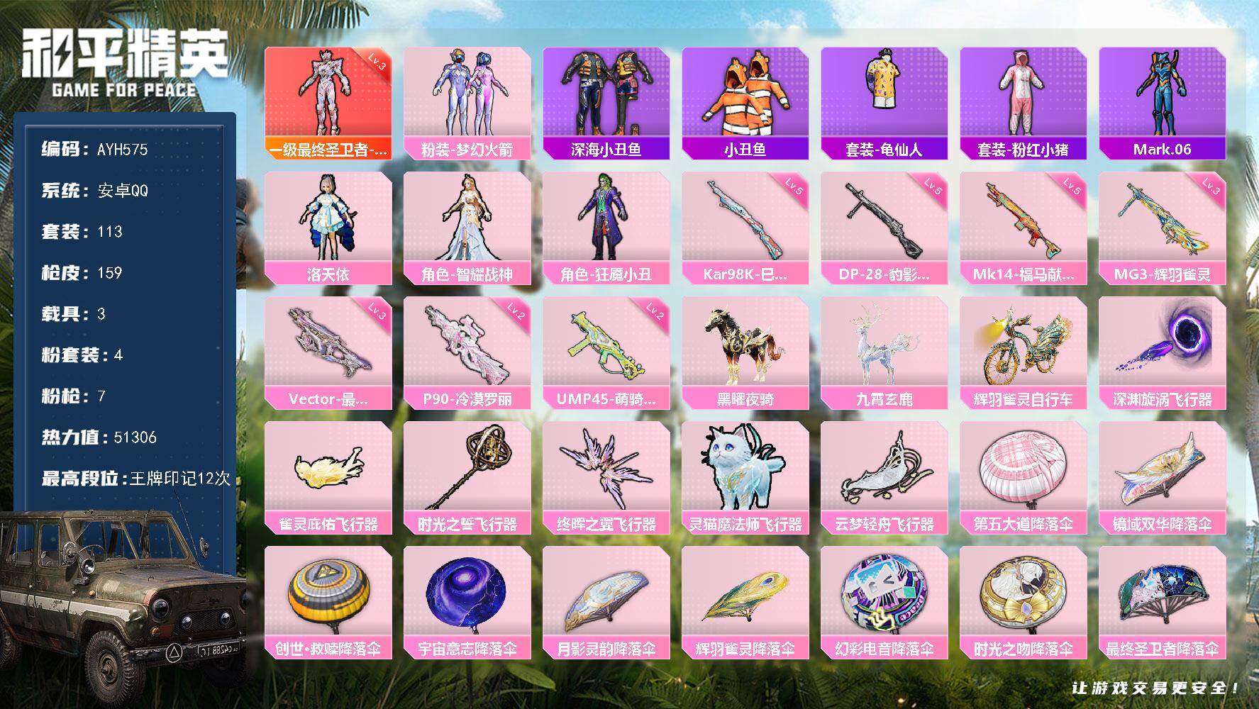 1神装-4粉装-7特效枪-3载具-6粉色飞行器-51306热力值-12王牌印记-113套装-159枪皮