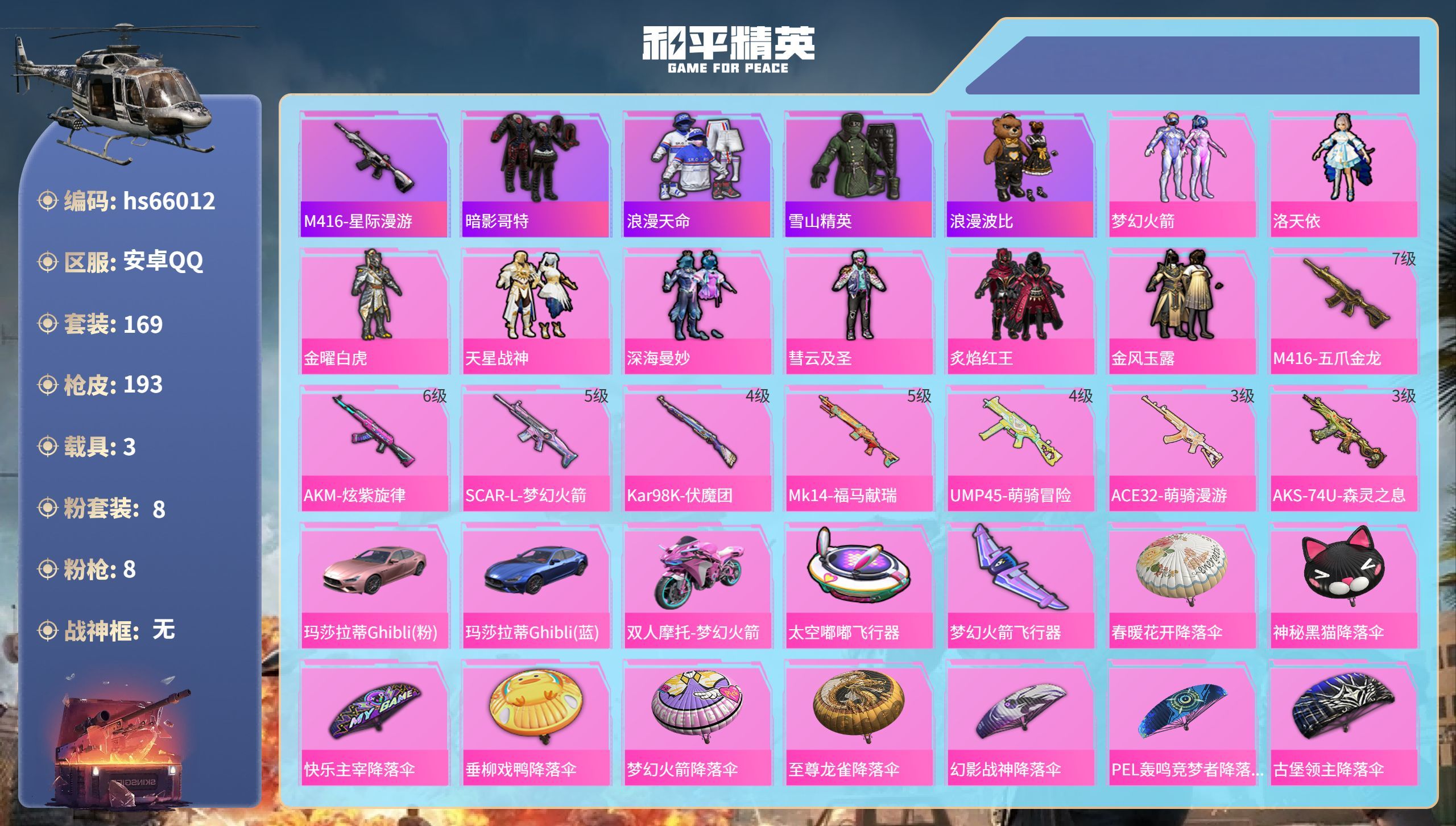 hs66012 安卓手Q-8王牌印记-8粉装-8特效枪-3载具-71083热力值-169套装-193