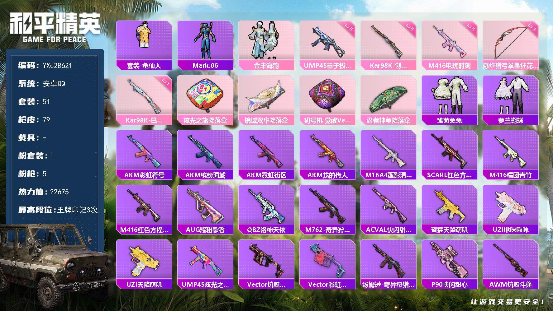 安卓 手Q-0粉装-6特效枪-0载具-1粉色飞行器-22650热力值-3王牌印