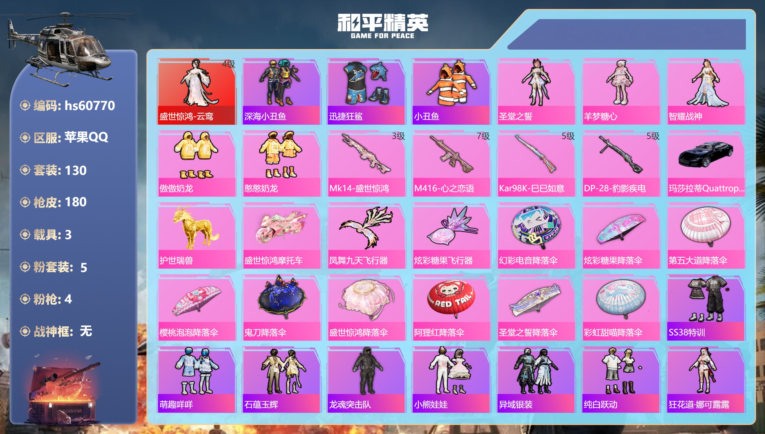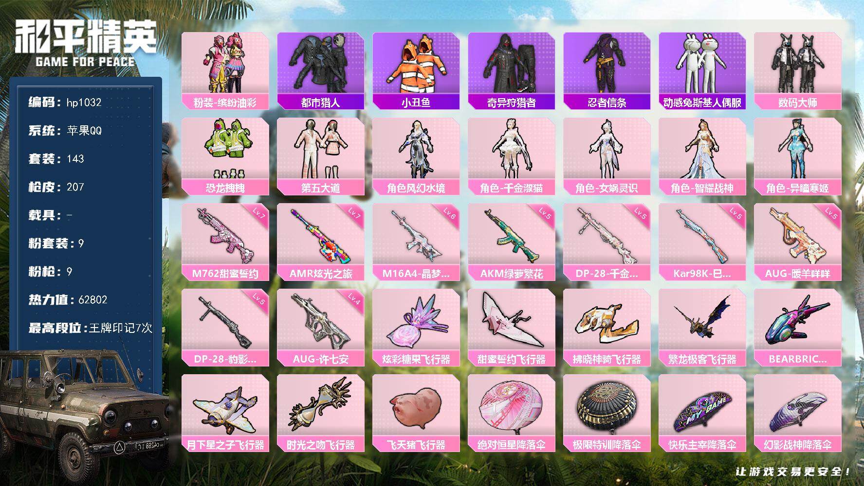 苹果 手Q-1神装-10粉装-9特效枪-1载具-2粉色飞行器-77325热力值