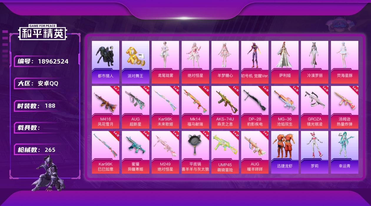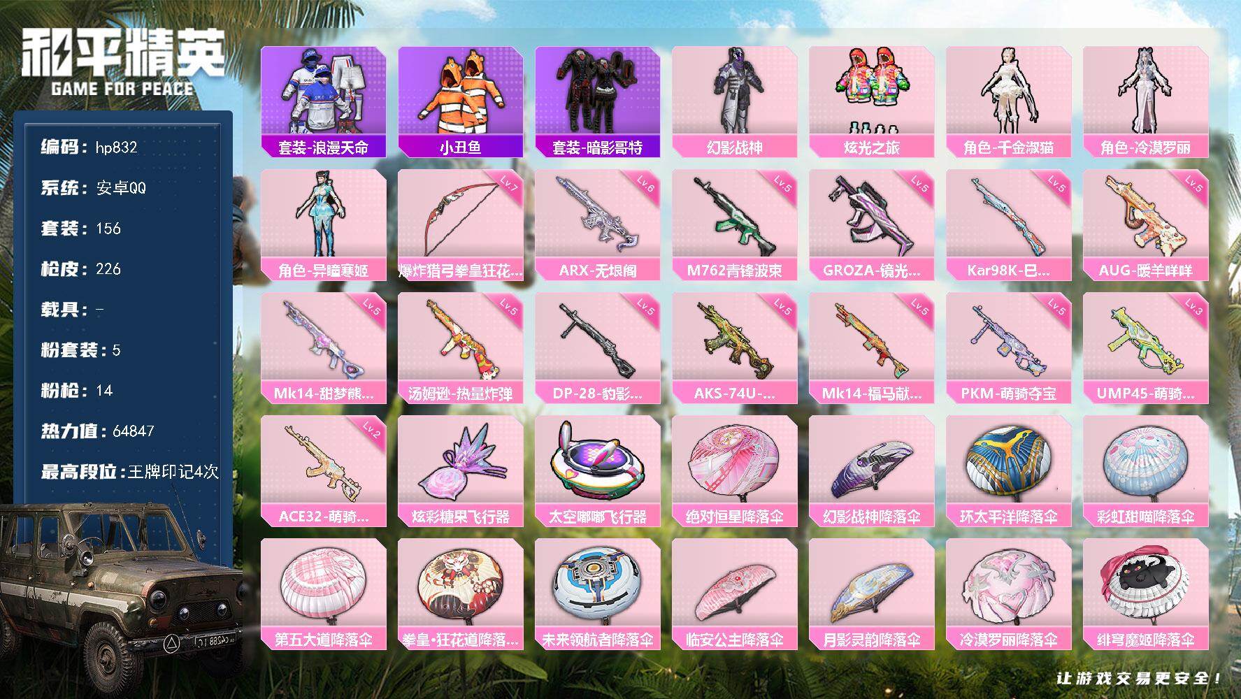 安卓 手Q-5粉装-14特效枪-0载具-2粉色飞行器-64847热力值-4王牌