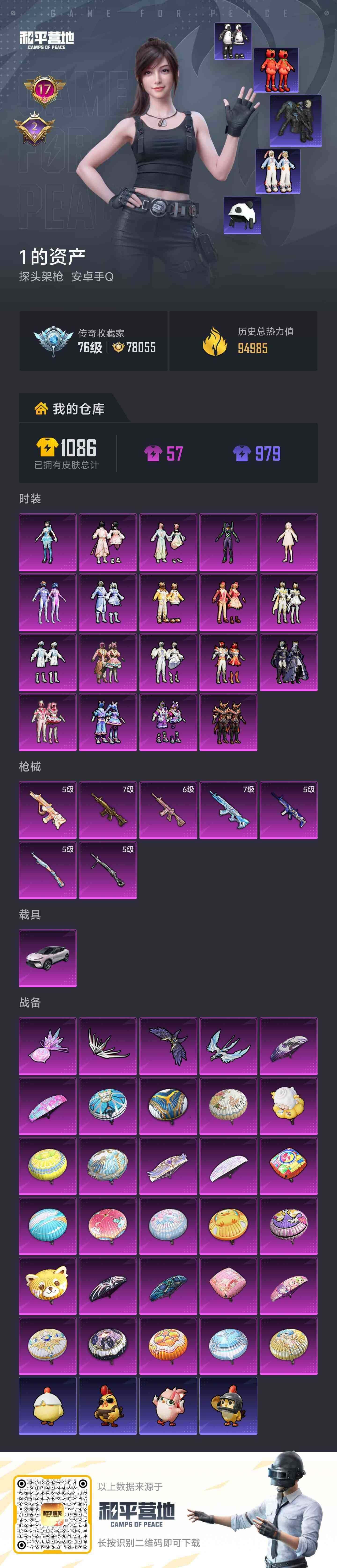 140套装/枪械9/装备221/载具3/战备129/王牌印记11/热力值57560/