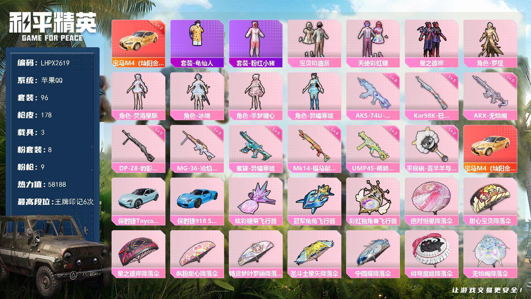 苹果 手Q-9粉装-9特效枪-0载具-8粉色飞行器-62802热力值-7王牌印