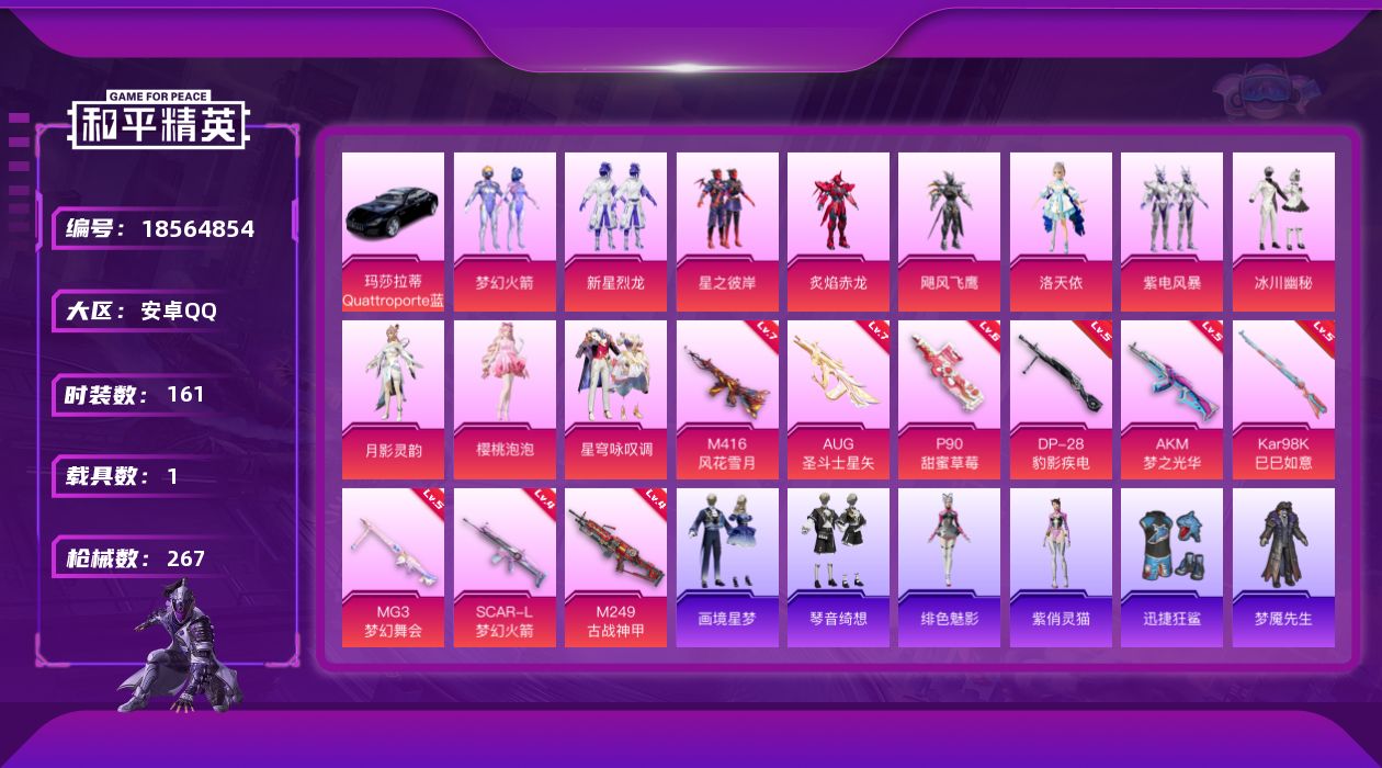 实名: 可修改 时装数: 290 载具数: 1 枪械数: 131 战备数: 1