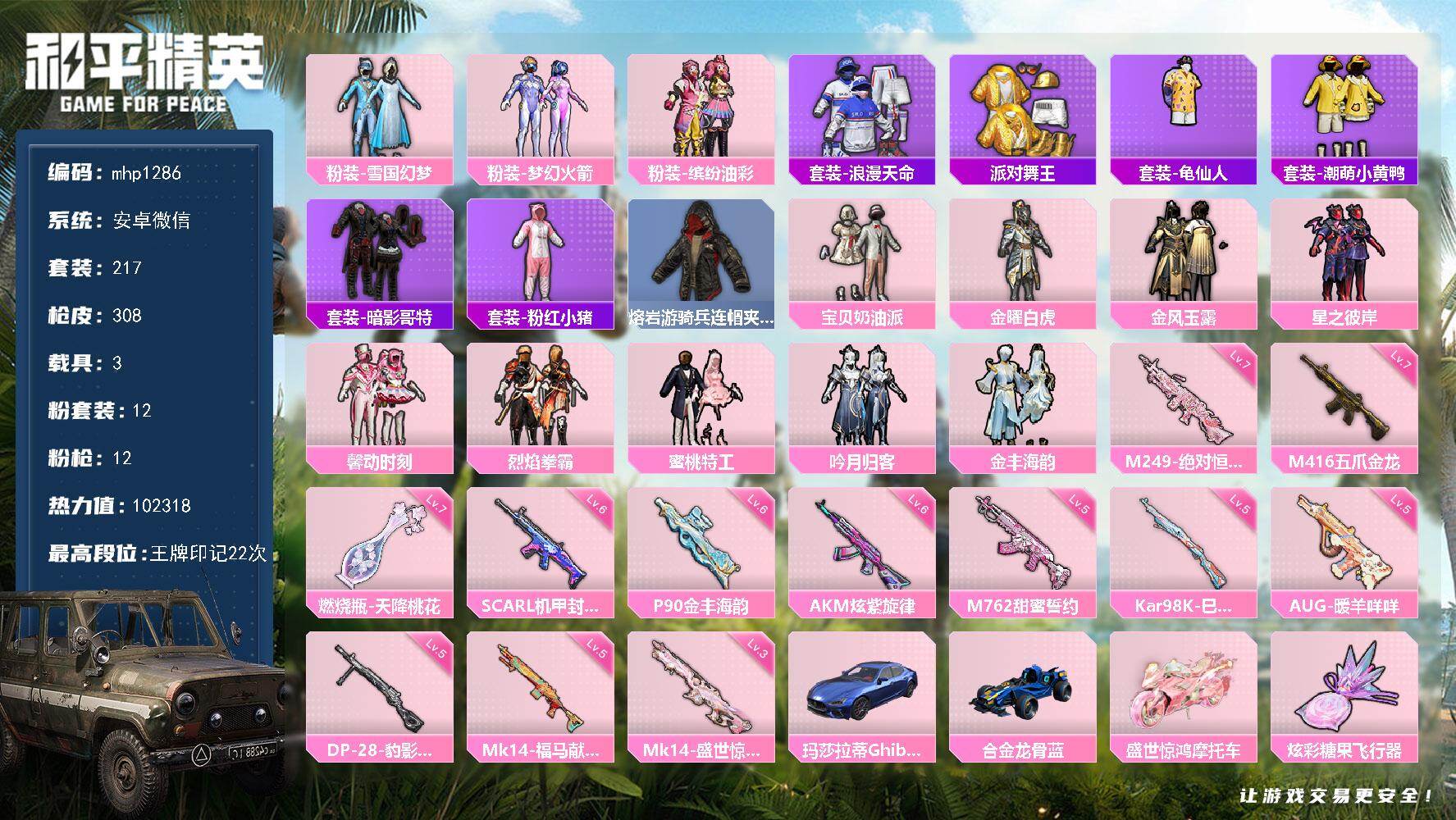 安卓手Q-4王牌印记-12粉装-7特效枪-5载具-44614热力值-88套装-117枪皮-2卓越印记