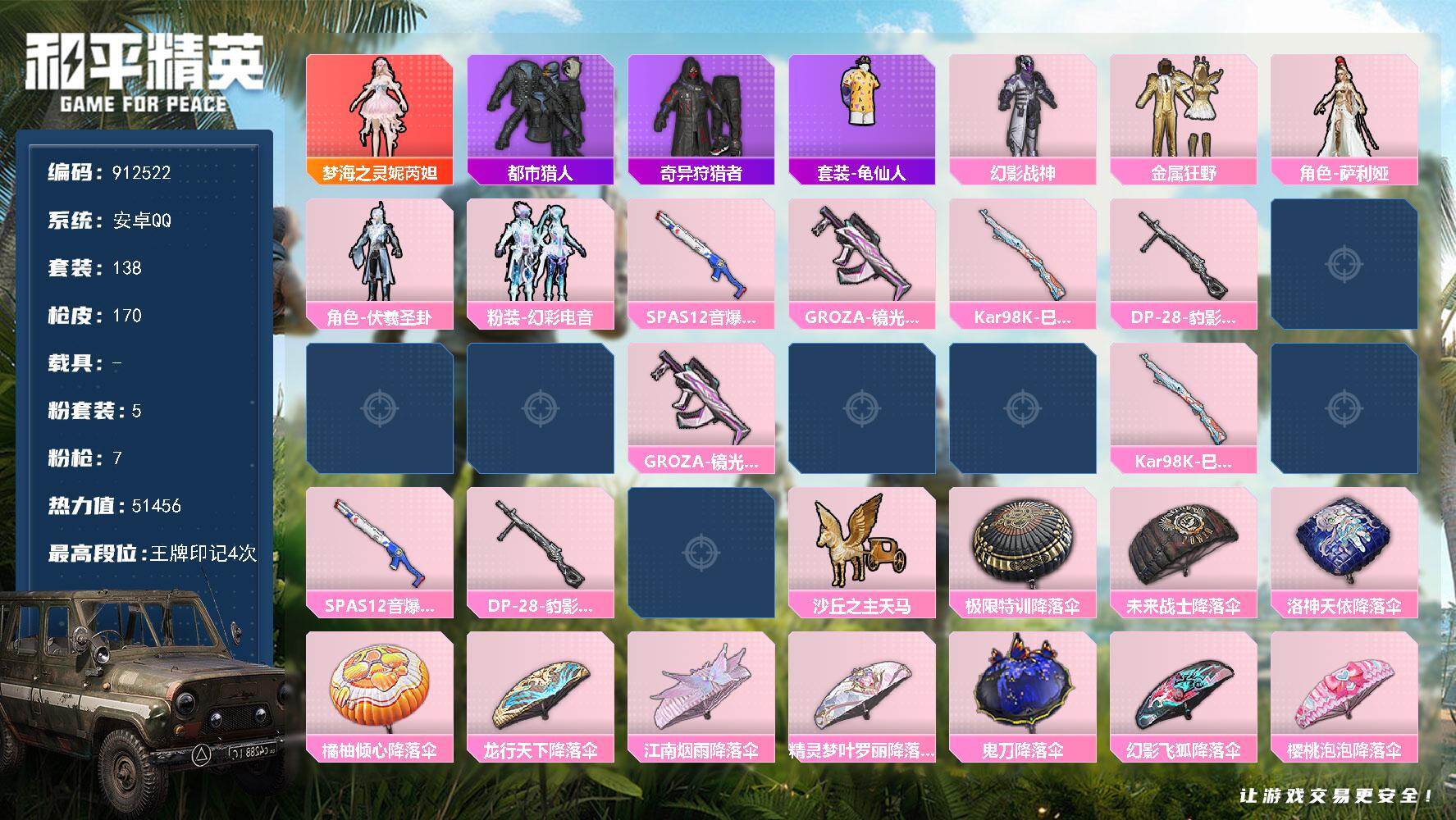 安卓 手Q-8粉装-4特效枪-4载具-4粉色飞行器-52945热力值-2王牌印记
