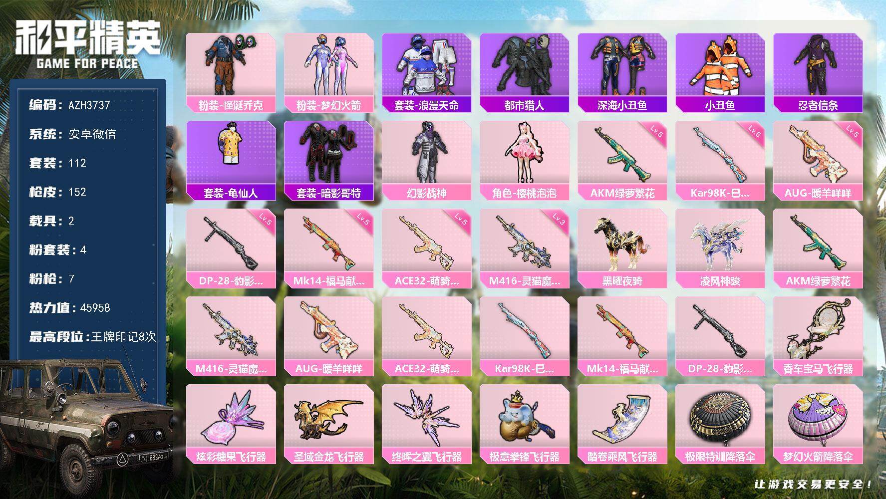 hs59298 安卓手Q-8王牌印记-6粉装-12特效枪-3载具-61417热力值-120套装-20